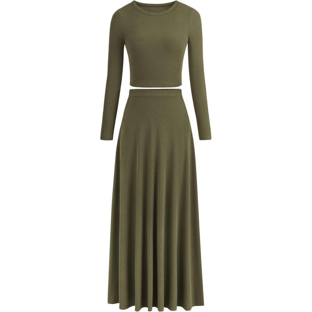 PRETTYGARDEN Women Fall Spring 2 Piece Outfits Dressy Casual Ribbed Knit Long Sleeve Crop Top Maxi Flowy Skirts Matching Sets(Army Green)