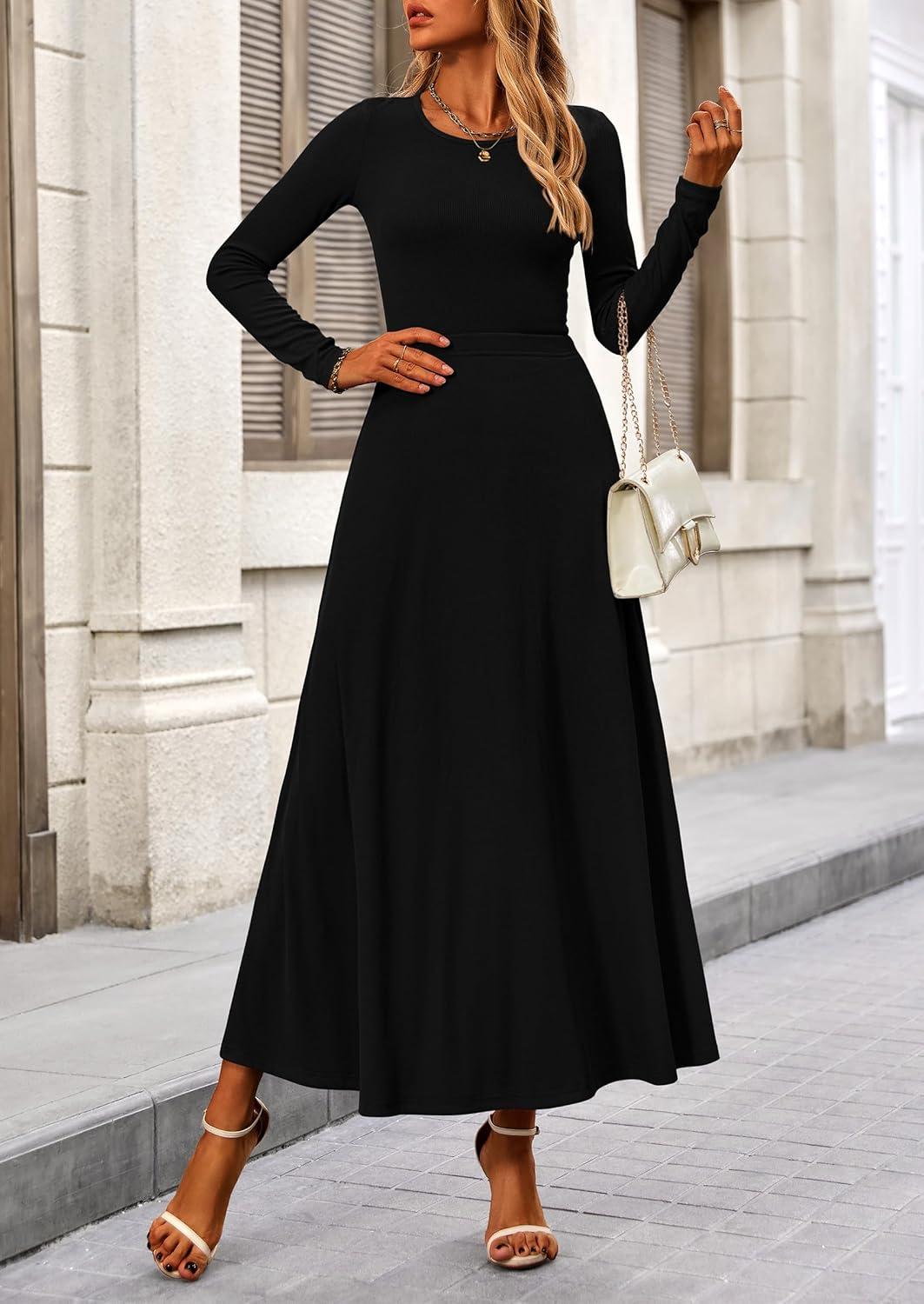 PRETTYGARDEN Women Fall Spring 2 Piece Outfits Dressy Casual Ribbed Knit Long Sleeve Crop Top Maxi Flowy Skirts Matching Sets(Black)