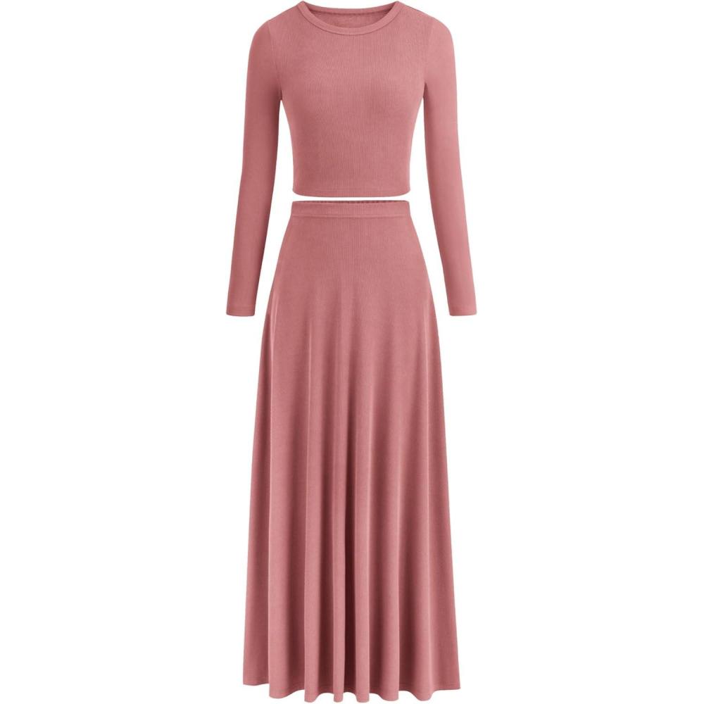 PRETTYGARDEN Women Fall Spring 2 Piece Outfits Dressy Casual Ribbed Knit Long Sleeve Crop Top Maxi Flowy Skirts Matching Sets(Dusty Pink)