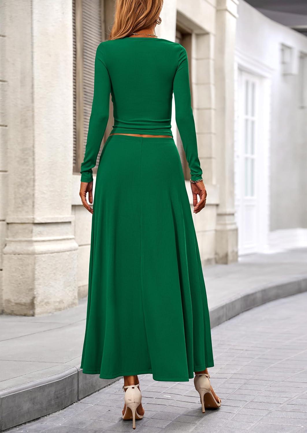 PRETTYGARDEN Women Fall Spring 2 Piece Outfits Dressy Casual Ribbed Knit Long Sleeve Crop Top Maxi Flowy Skirts Matching Sets(Green)
