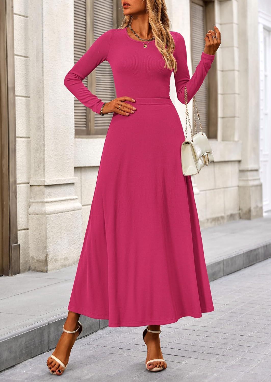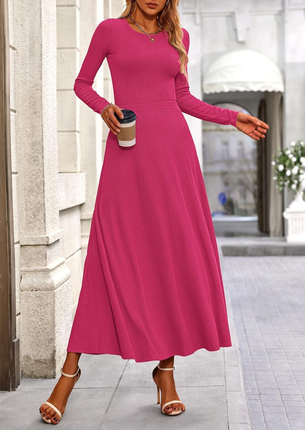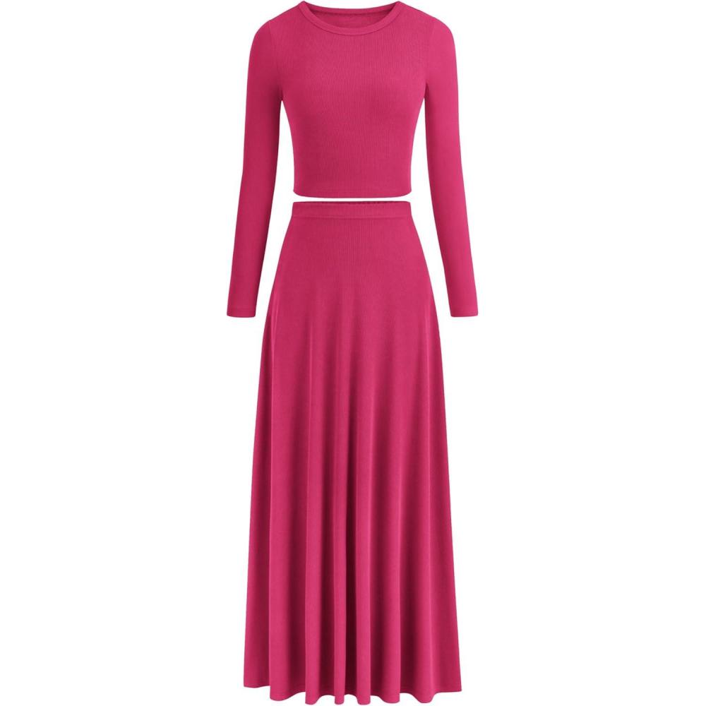 PRETTYGARDEN Women Fall Spring 2 Piece Outfits Dressy Casual Ribbed Knit Long Sleeve Crop Top Maxi Flowy Skirts Matching Sets(Rose Red)