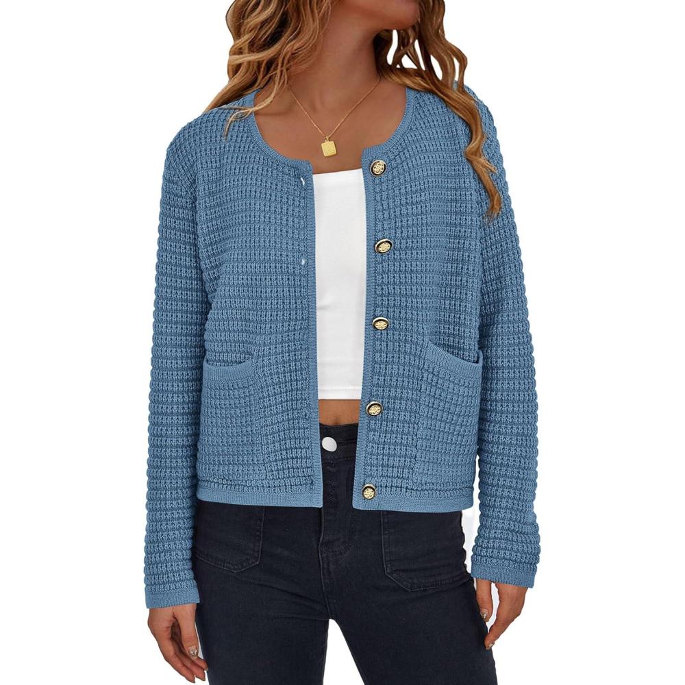 imagePRETTYGARDEN Women Knit Cardigan Sweaters Fall Fashion Long Sleeve Open Front Button Down Trendy Casual Jacket Winter ClothesMist Blue