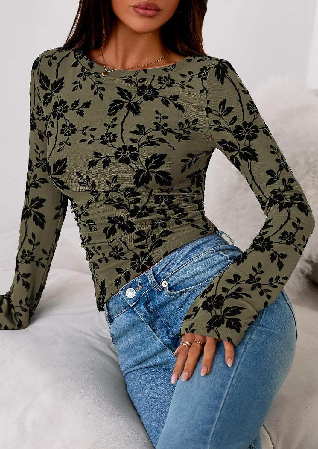 imagePRETTYGARDEN Women Long Sleeve Floral Mesh Tops Blouse 2025 Fall Trendy Boat Neck Ruched Fitted Shirt Going Out Date OutfitsArmy Green