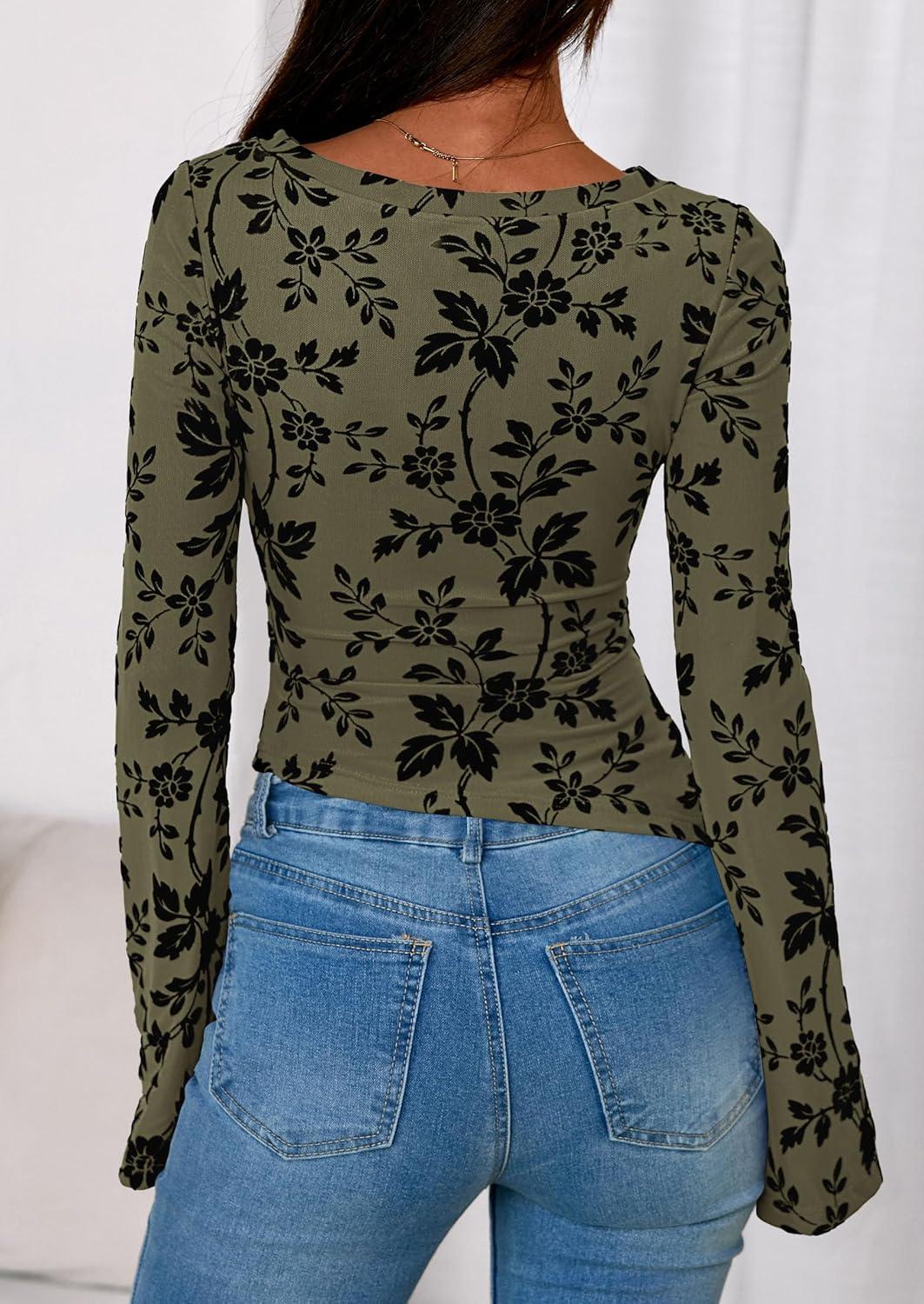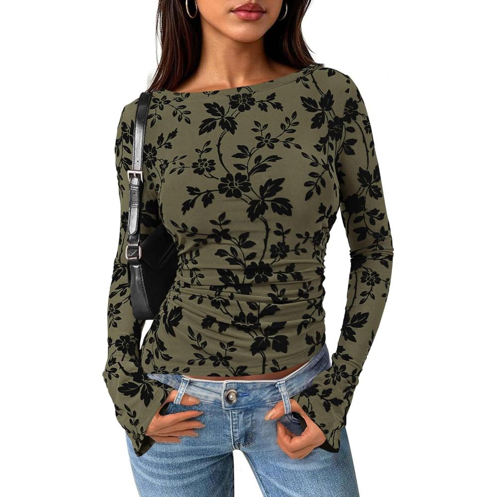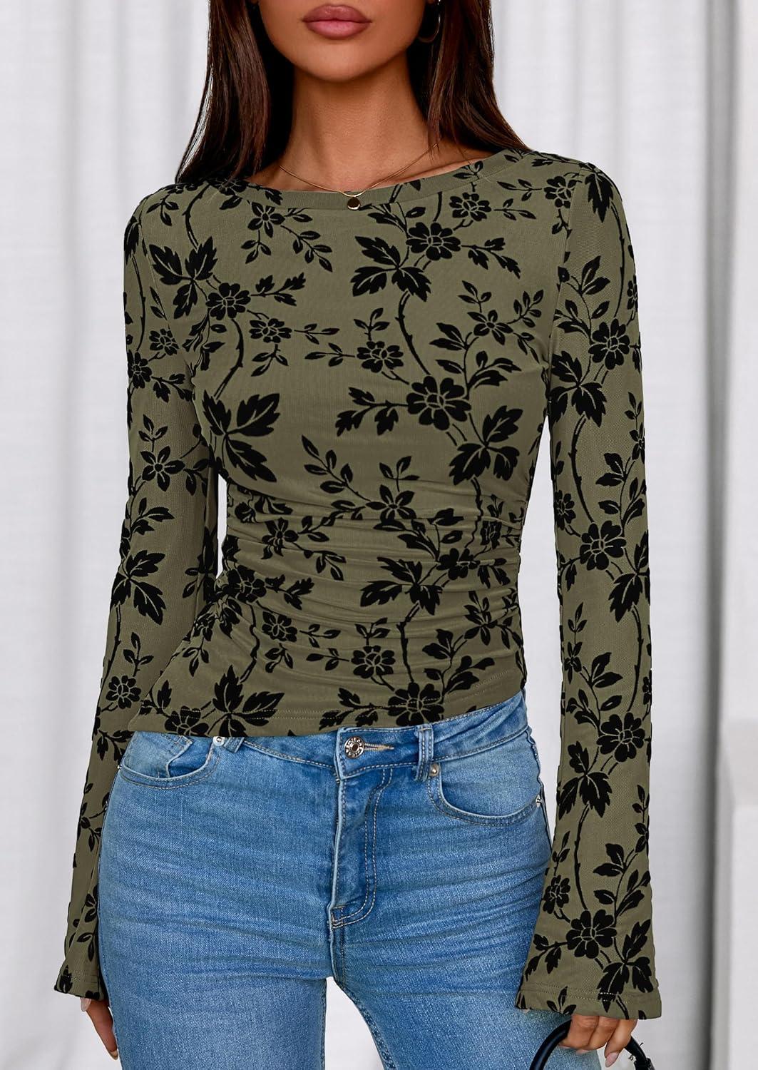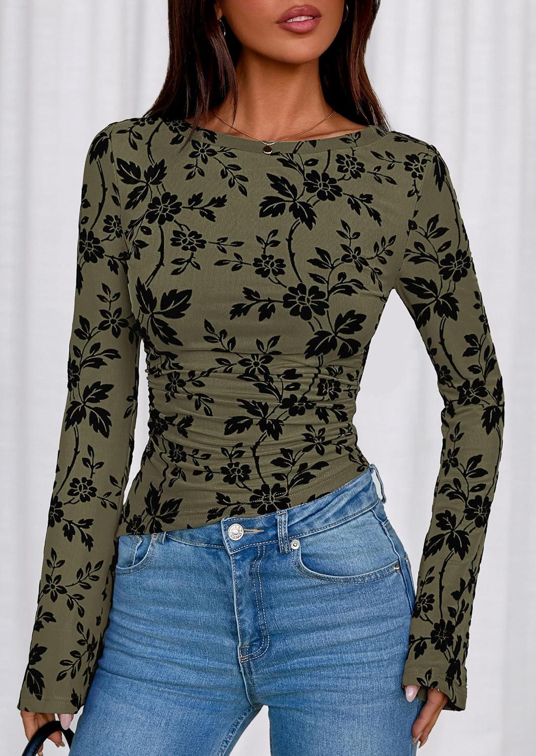 PRETTYGARDEN Women Long Sleeve Floral Mesh Tops Blouse 2025 Fall Trendy Boat Neck Ruched Fitted Shirt Going Out Date Outfits(Army Green)
