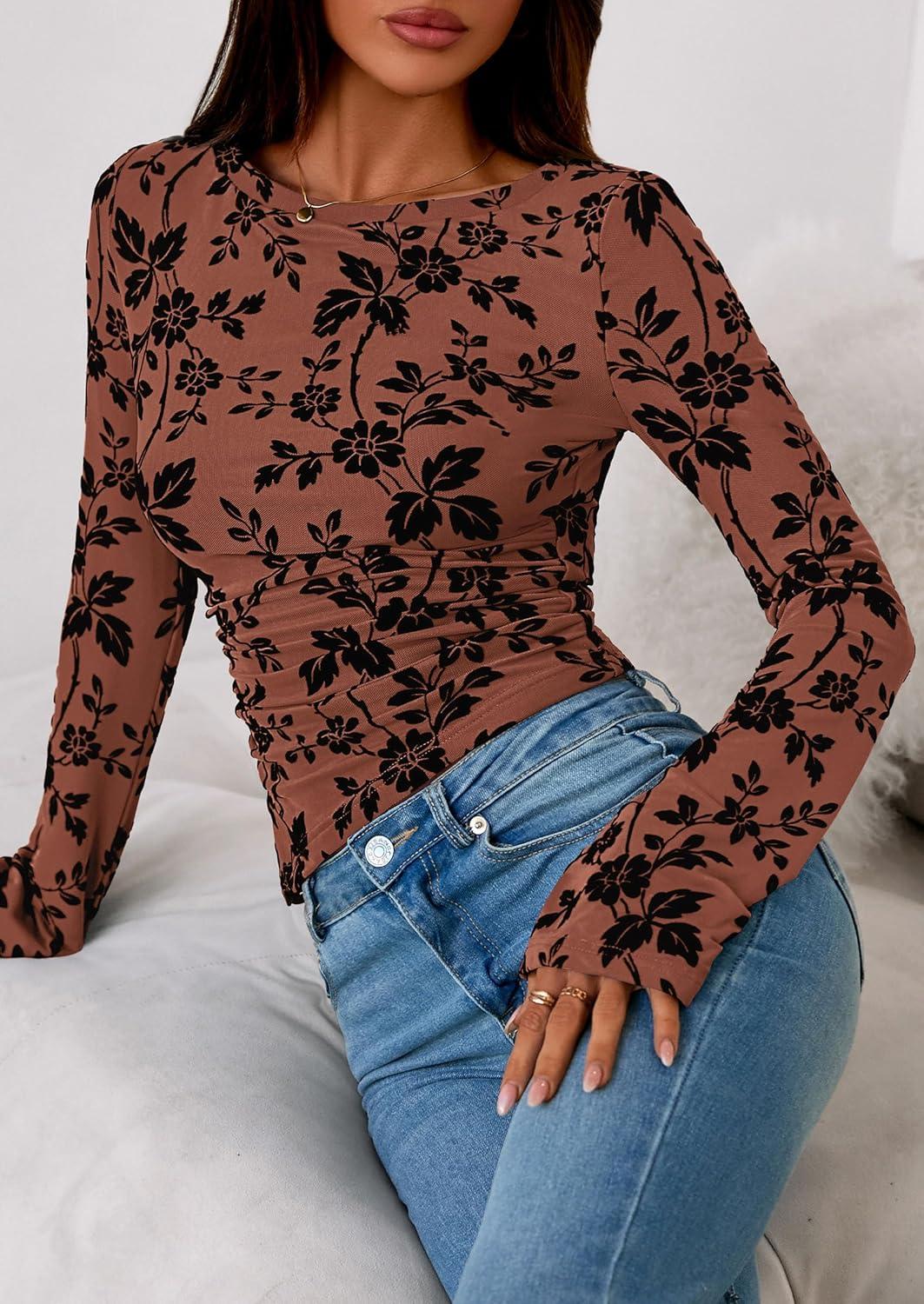 PRETTYGARDEN Women Long Sleeve Floral Mesh Tops Blouse 2025 Fall Trendy Boat Neck Ruched Fitted Shirt Going Out Date Outfits(Brown)