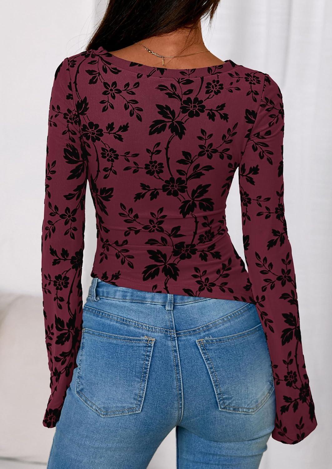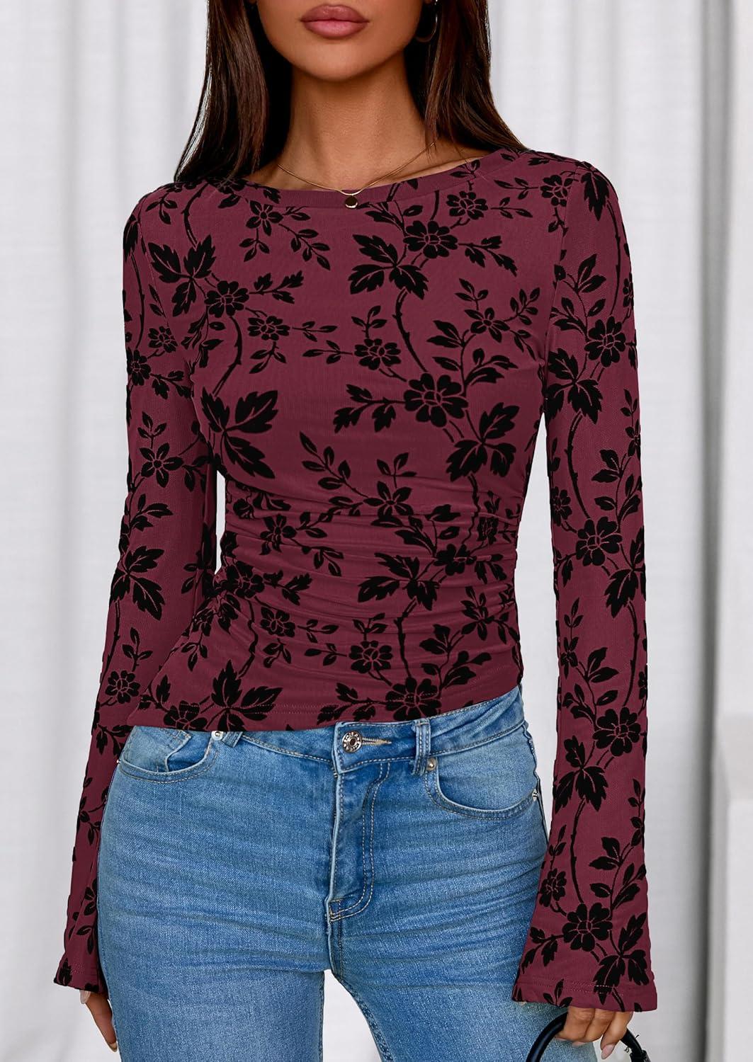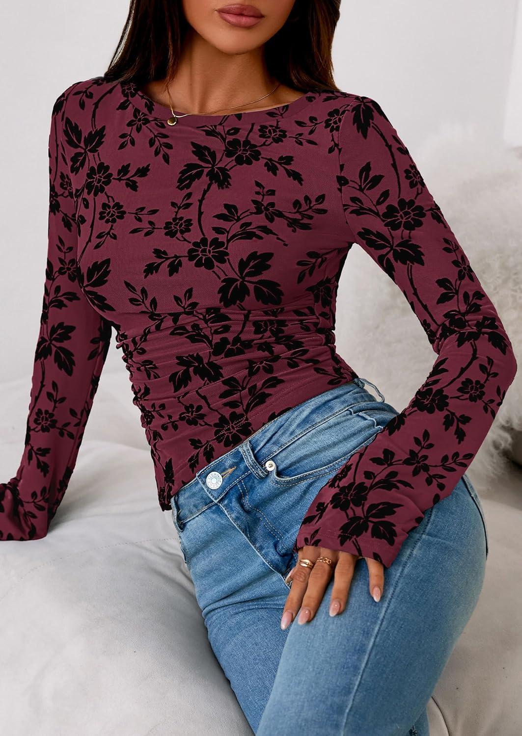 PRETTYGARDEN Women Long Sleeve Floral Mesh Tops Blouse 2025 Fall Trendy Boat Neck Ruched Fitted Shirt Going Out Date Outfits(Burgundy)