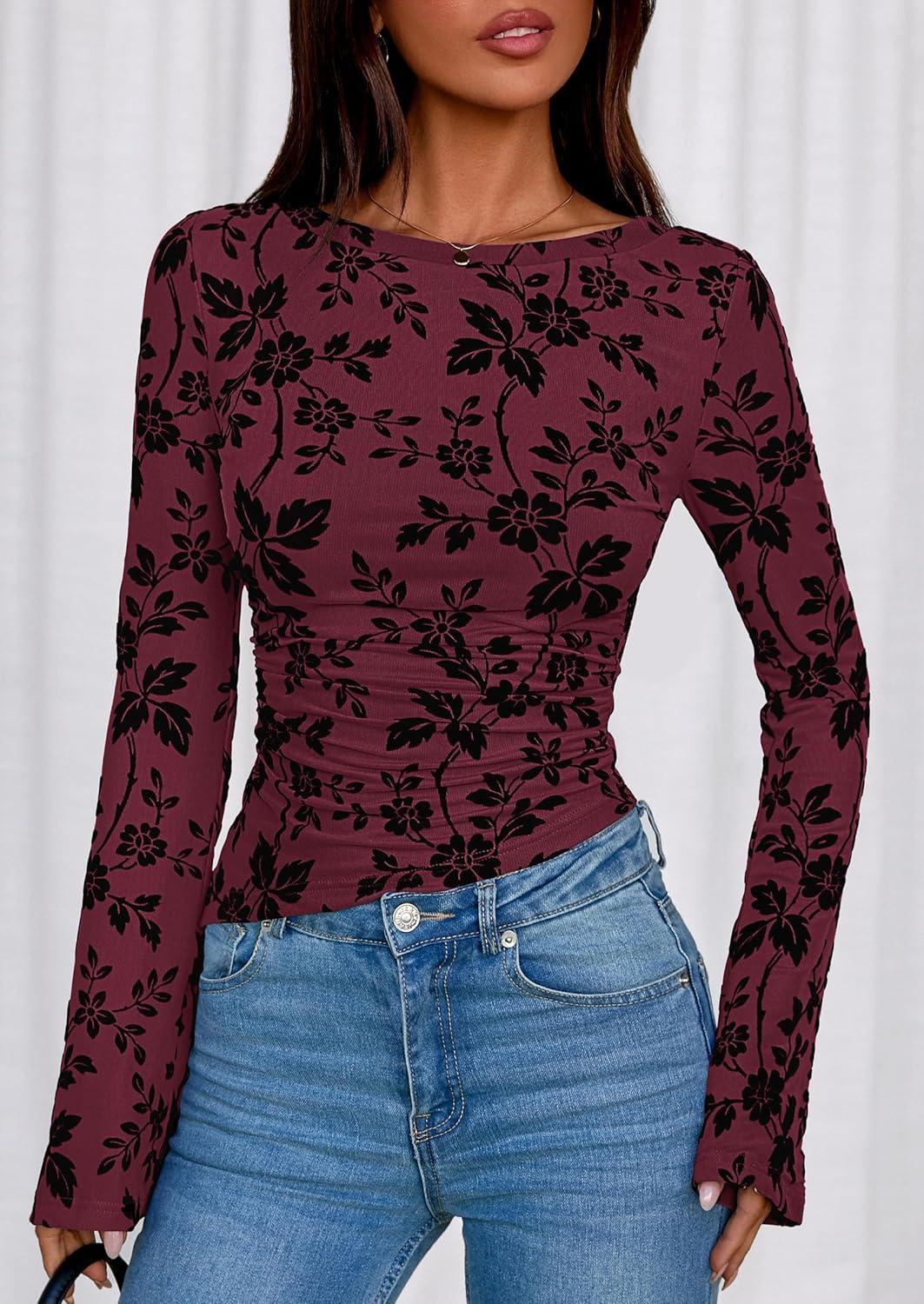 imagePRETTYGARDEN Women Long Sleeve Floral Mesh Tops Blouse 2025 Fall Trendy Boat Neck Ruched Fitted Shirt Going Out Date OutfitsBurgundy