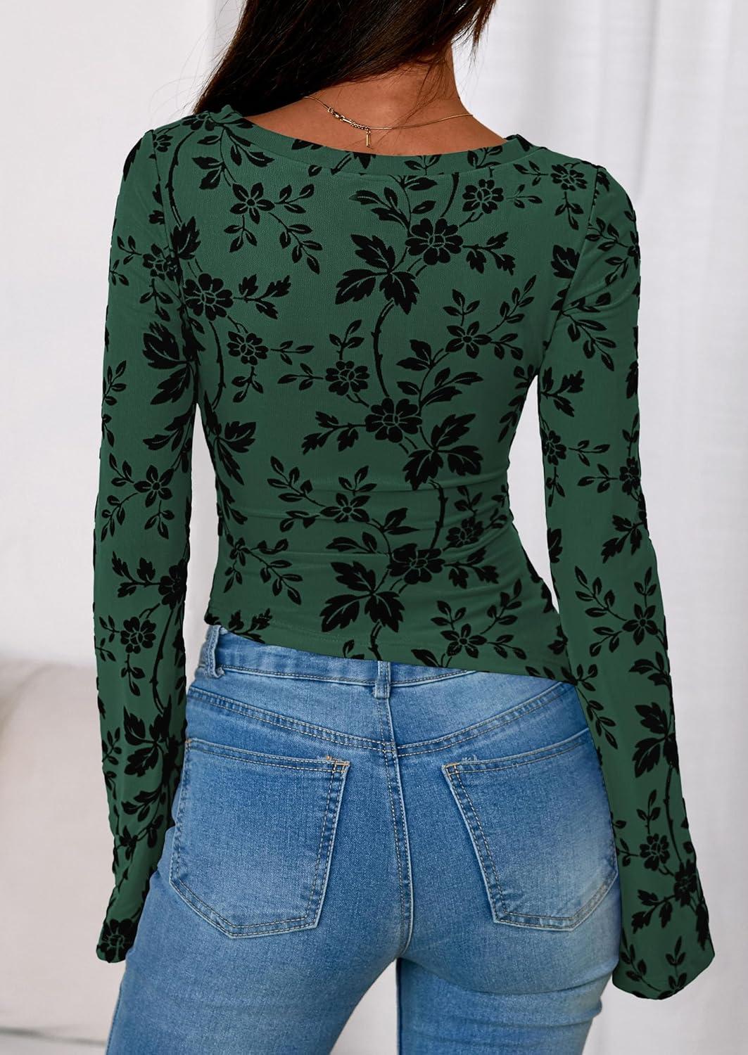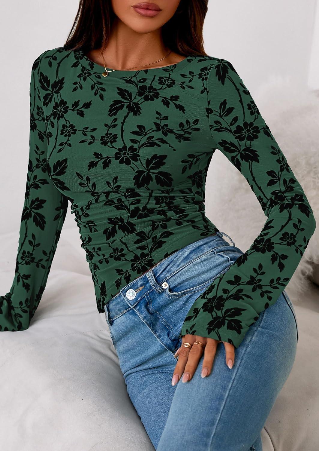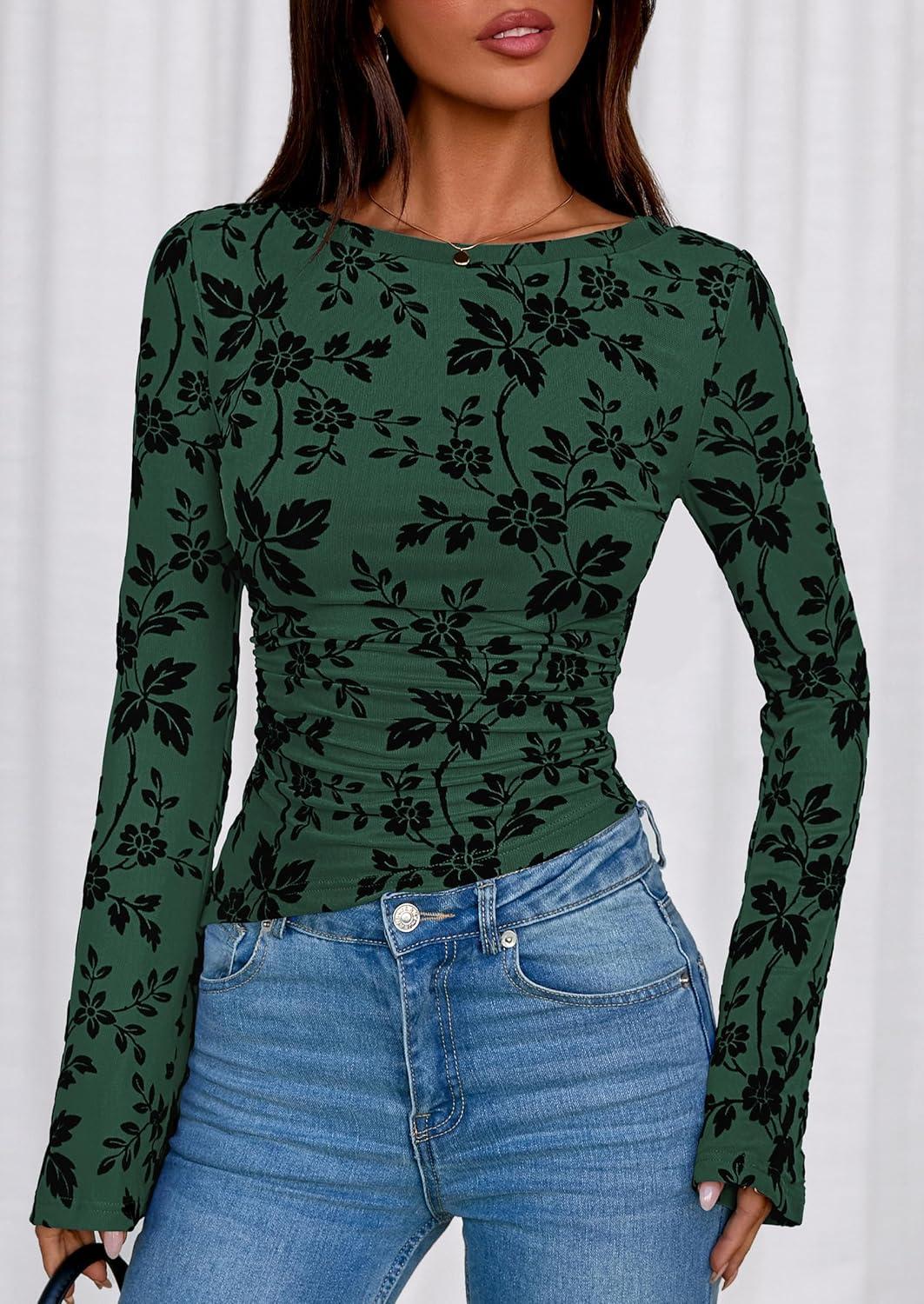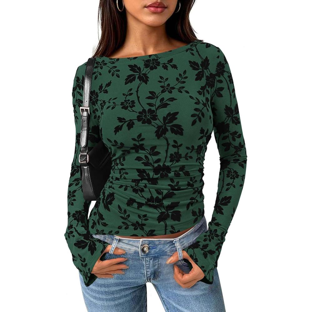 PRETTYGARDEN Women Long Sleeve Floral Mesh Tops Blouse 2025 Fall Trendy Boat Neck Ruched Fitted Shirt Going Out Date Outfits(Dark Green)