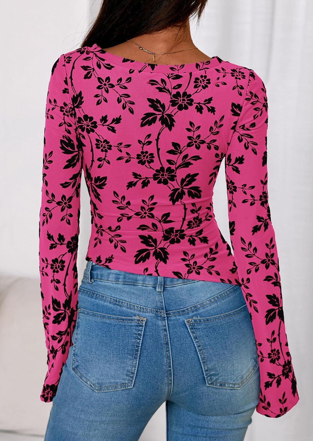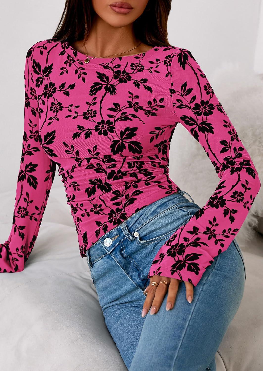 PRETTYGARDEN Women Long Sleeve Floral Mesh Tops Blouse 2025 Fall Trendy Boat Neck Ruched Fitted Shirt Going Out Date Outfits(Hot Pink)