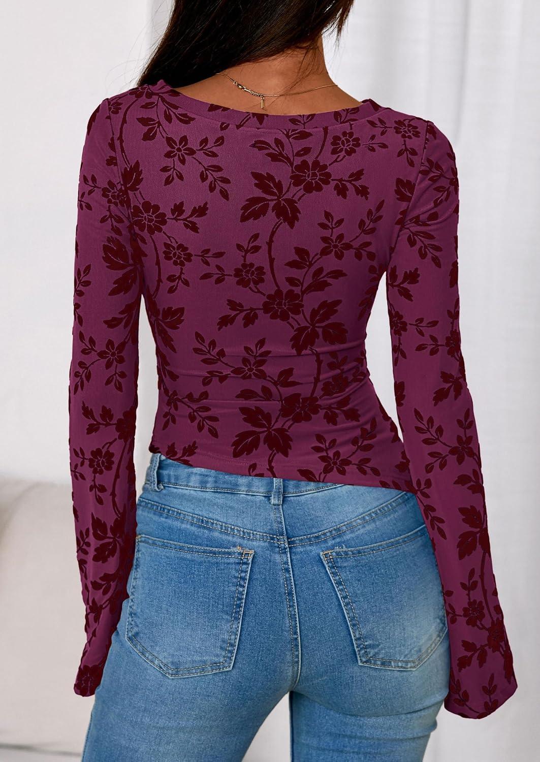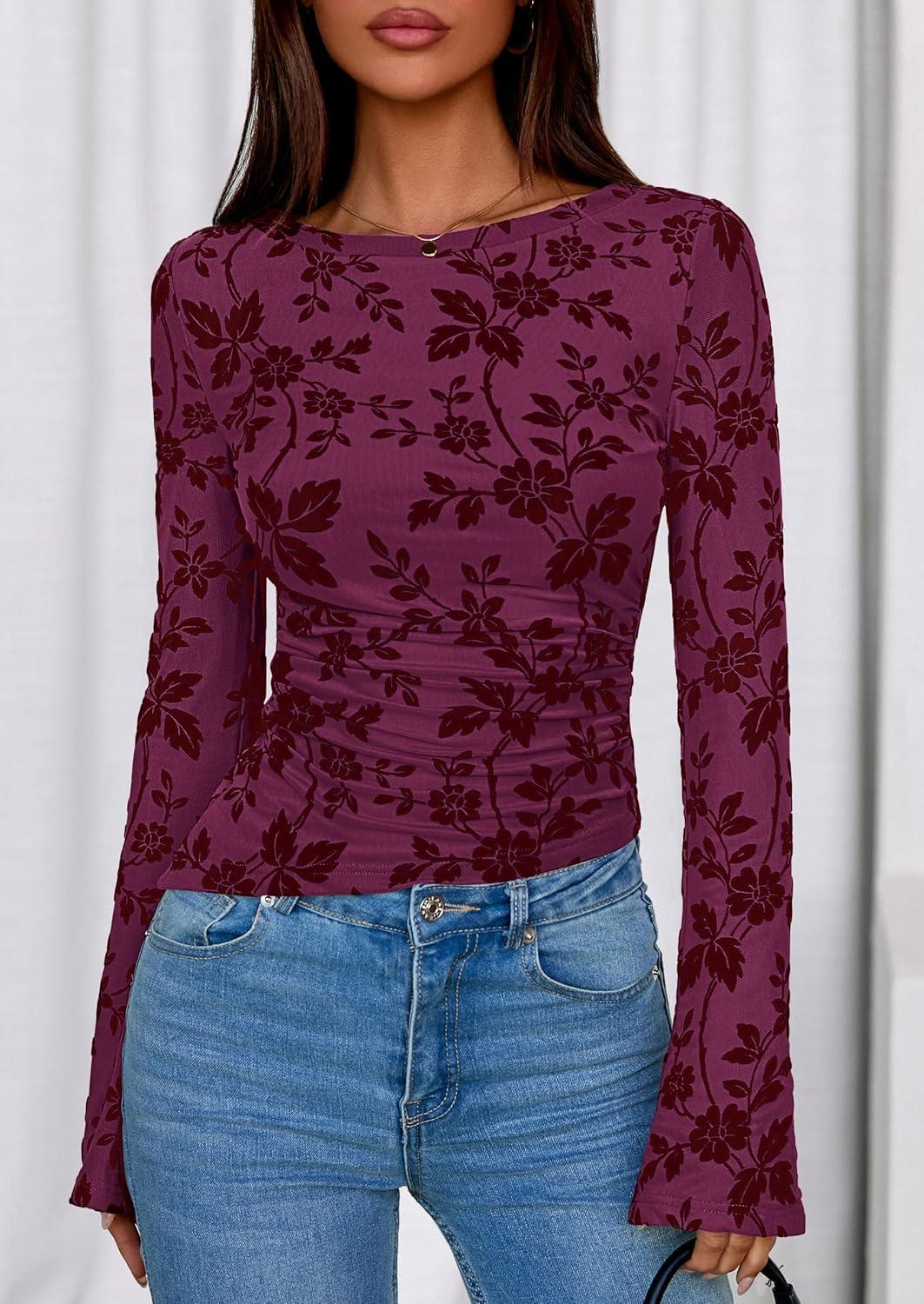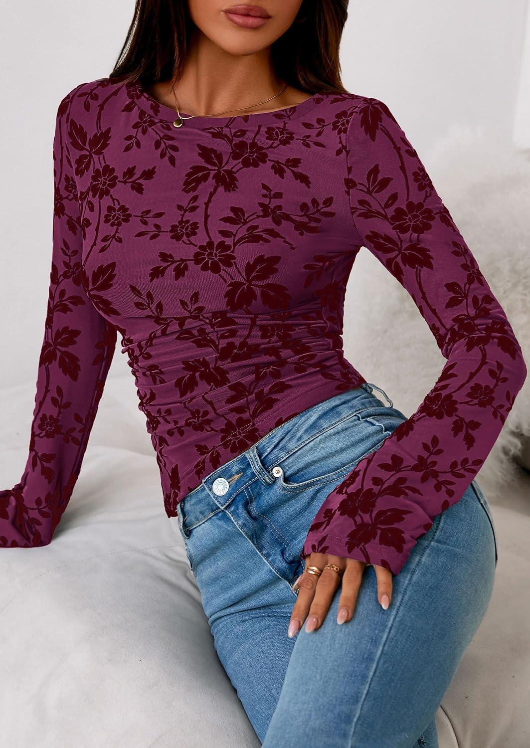 PRETTYGARDEN Women Long Sleeve Floral Mesh Tops Blouse 2025 Fall Trendy Boat Neck Ruched Fitted Shirt Going Out Date Outfits(Purple Red)
