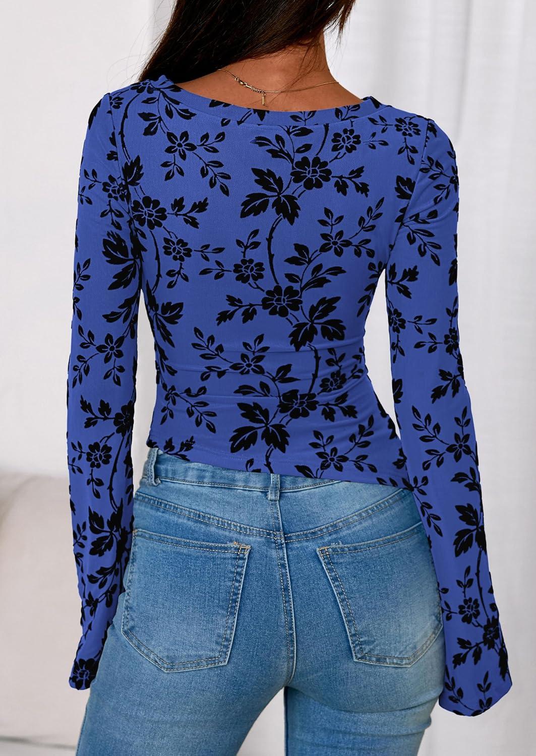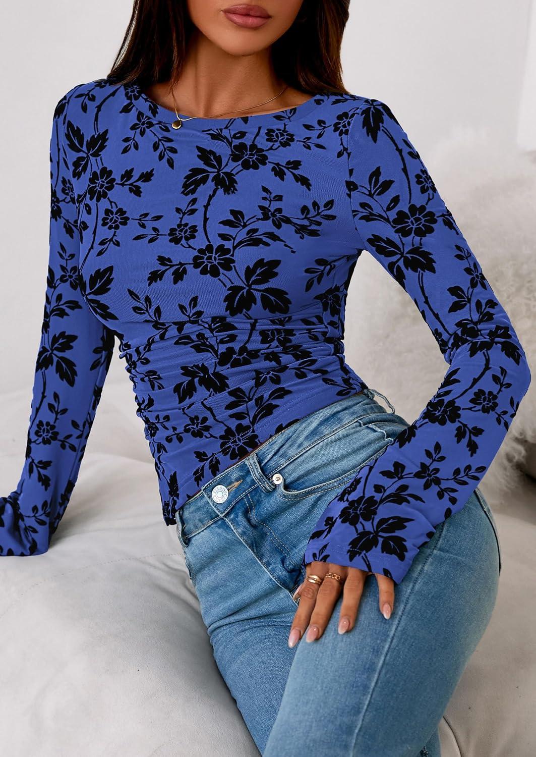PRETTYGARDEN Women Long Sleeve Floral Mesh Tops Blouse 2025 Fall Trendy Boat Neck Ruched Fitted Shirt Going Out Date Outfits(Royal Blue)