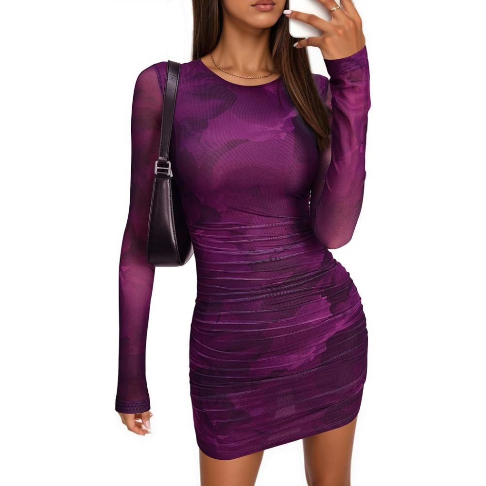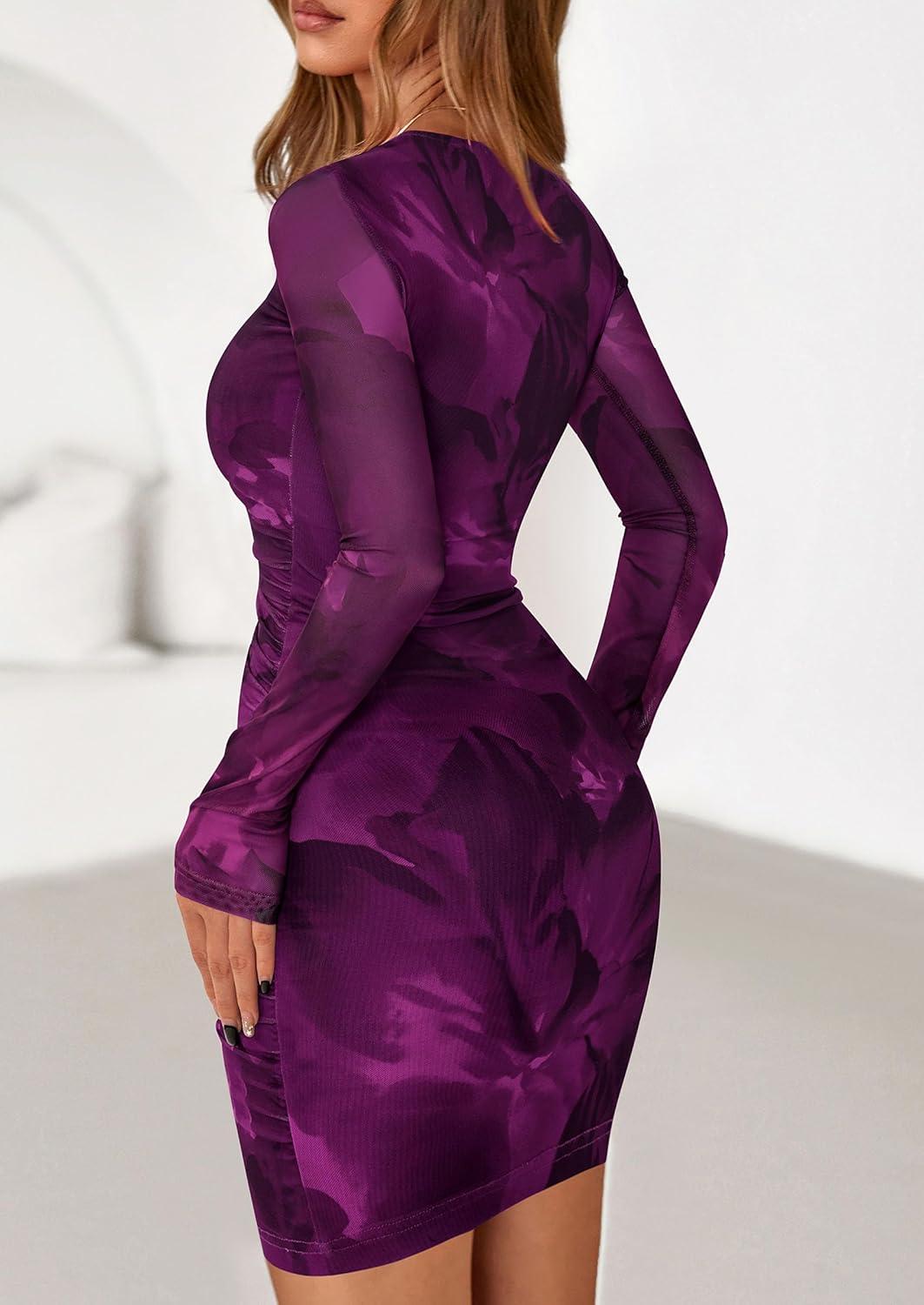 PRETTYGARDEN Women Long Sleeve Mini Fall Dress 2025 Tie Dye Print Bodycon Cocktail Party Club Outfits Homecoming Dresses(Floral Purple)