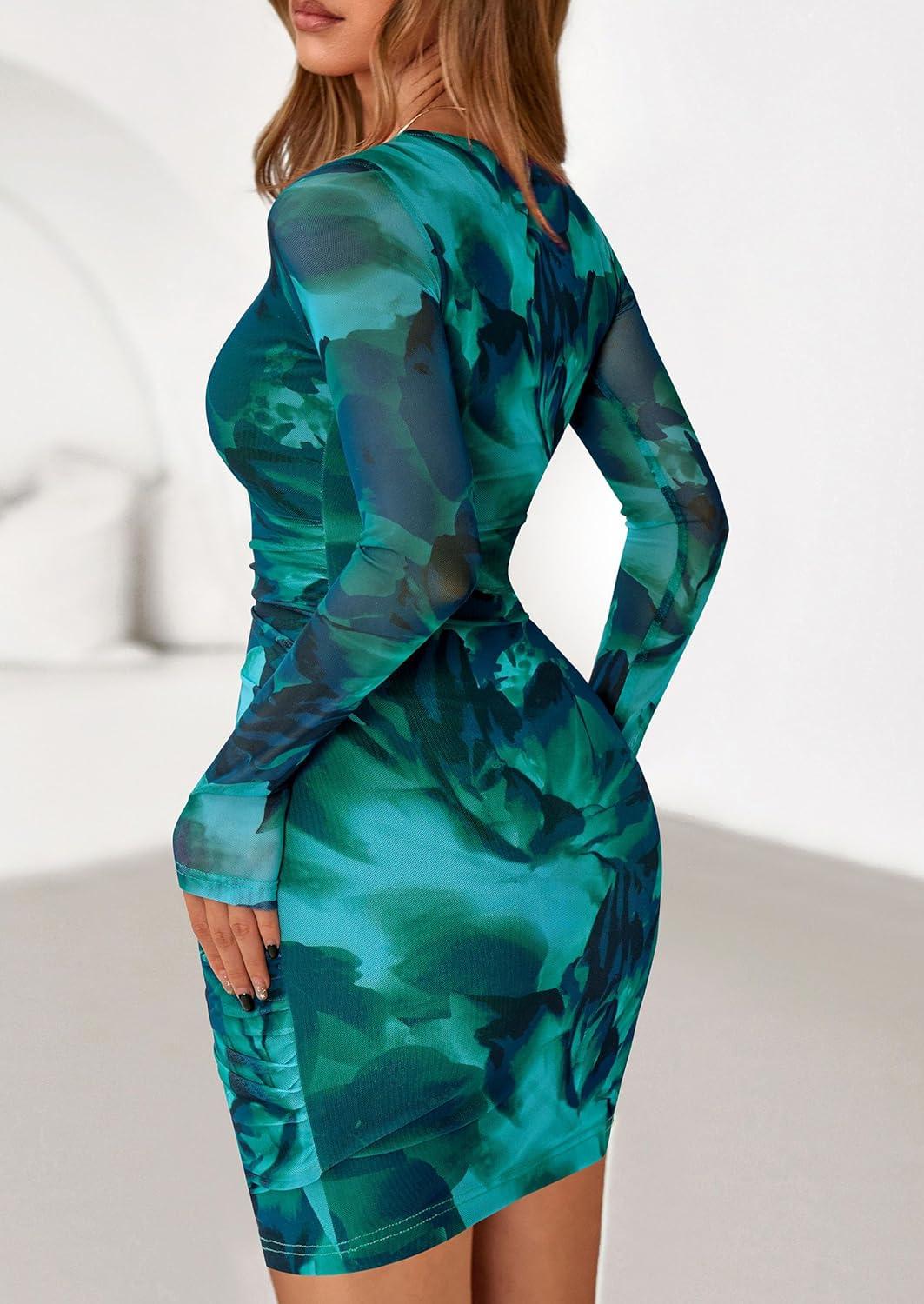 PRETTYGARDEN Women Long Sleeve Mini Fall Dress 2025 Tie Dye Print Bodycon Cocktail Party Club Outfits Homecoming Dresses(Lake Blue Floral)