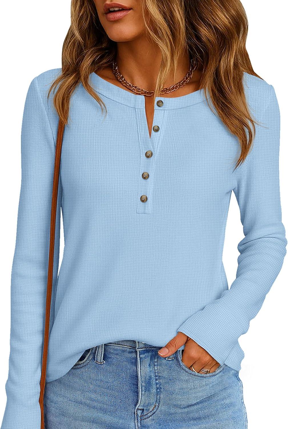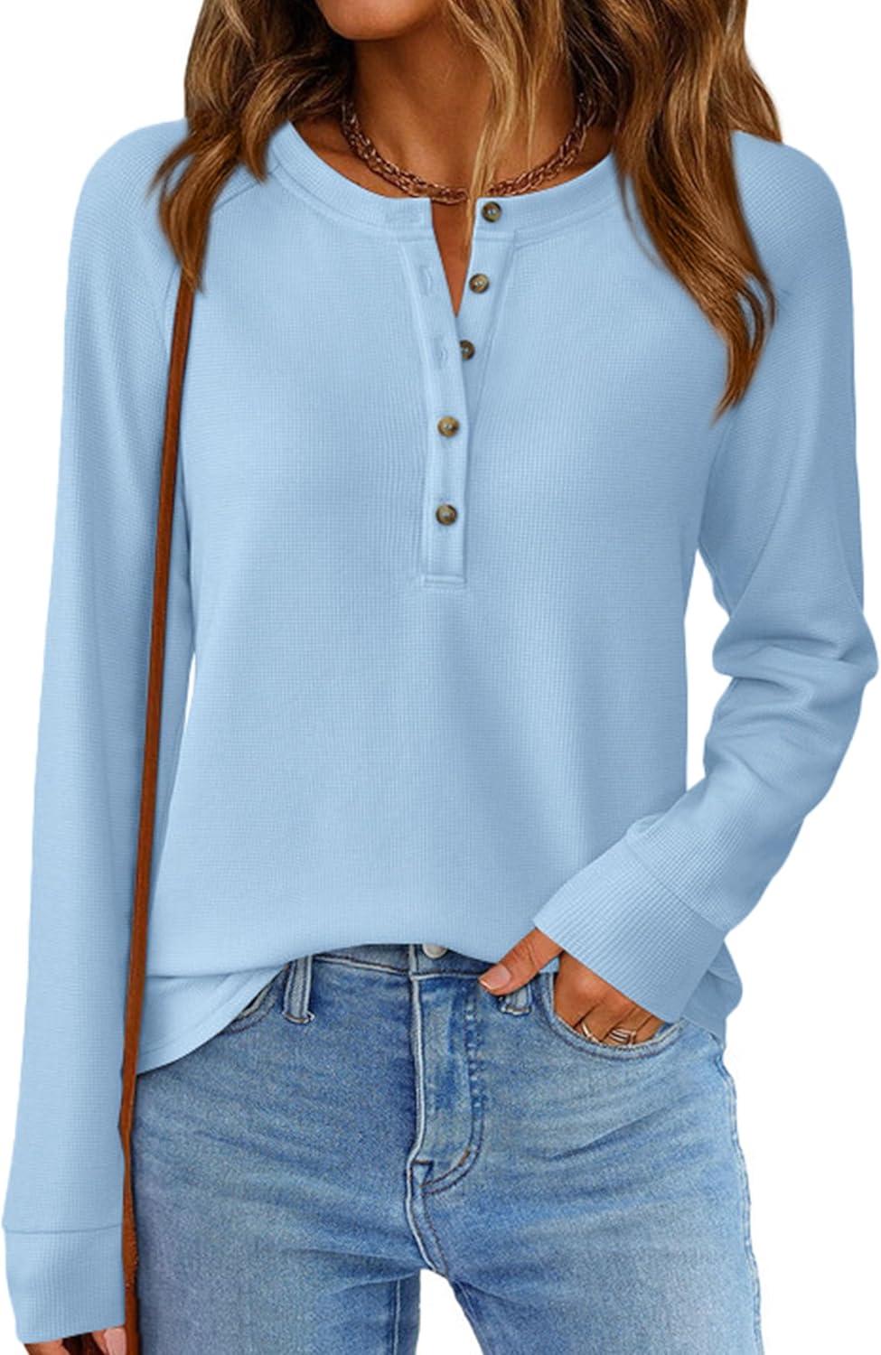 imagePRETTYGARDEN Women Long Sleeve Waffle Knit Shirts 2025 Fall Clothes Casual Button Up Henley V Neck Tunic Tops Loose Basic TeeLight Blue