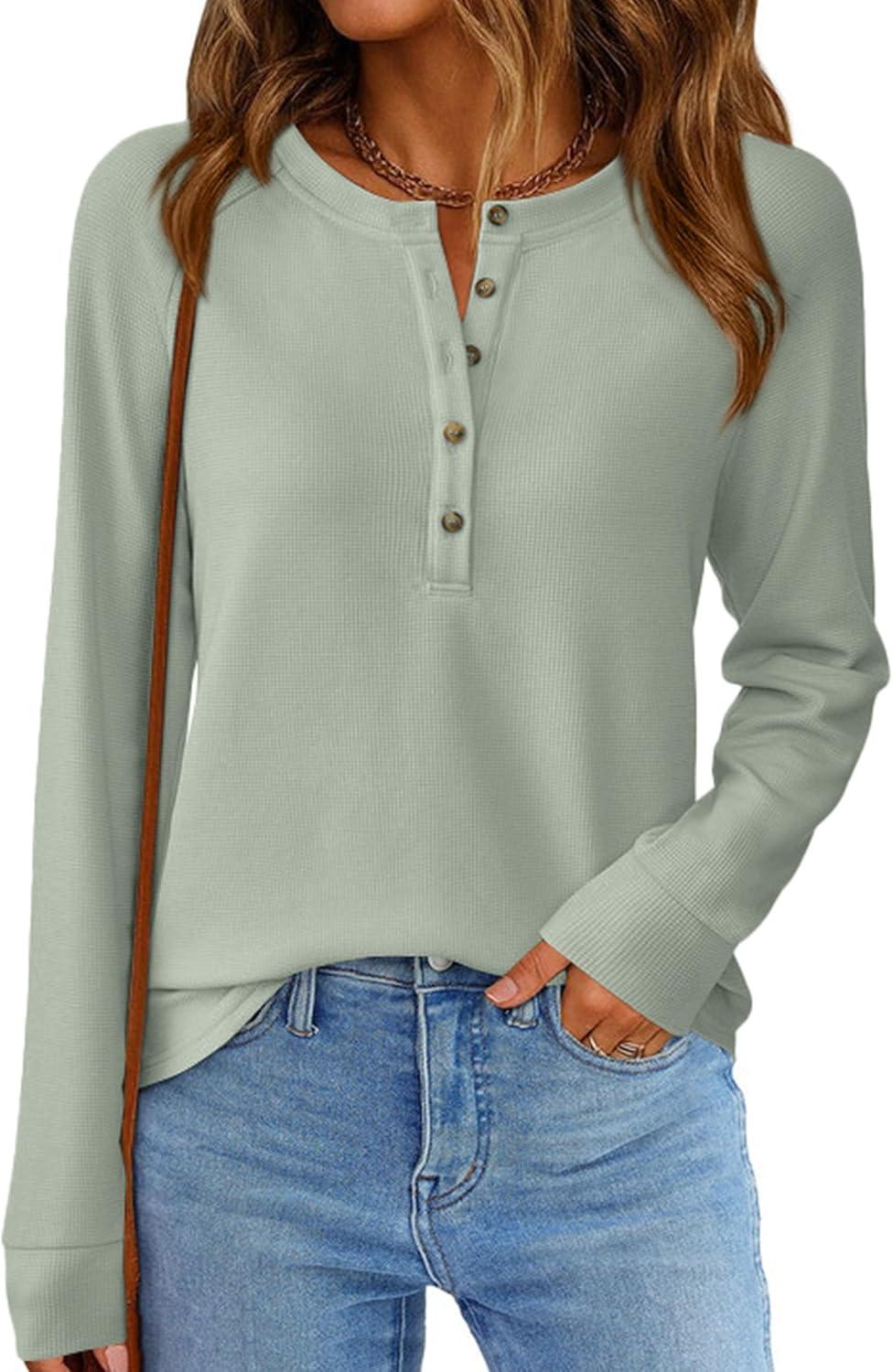 PRETTYGARDEN Women Long Sleeve Waffle Knit Shirts 2025 Fall Clothes Casual Button Up Henley V Neck Tunic Tops Loose Basic Tee(Sage Green)