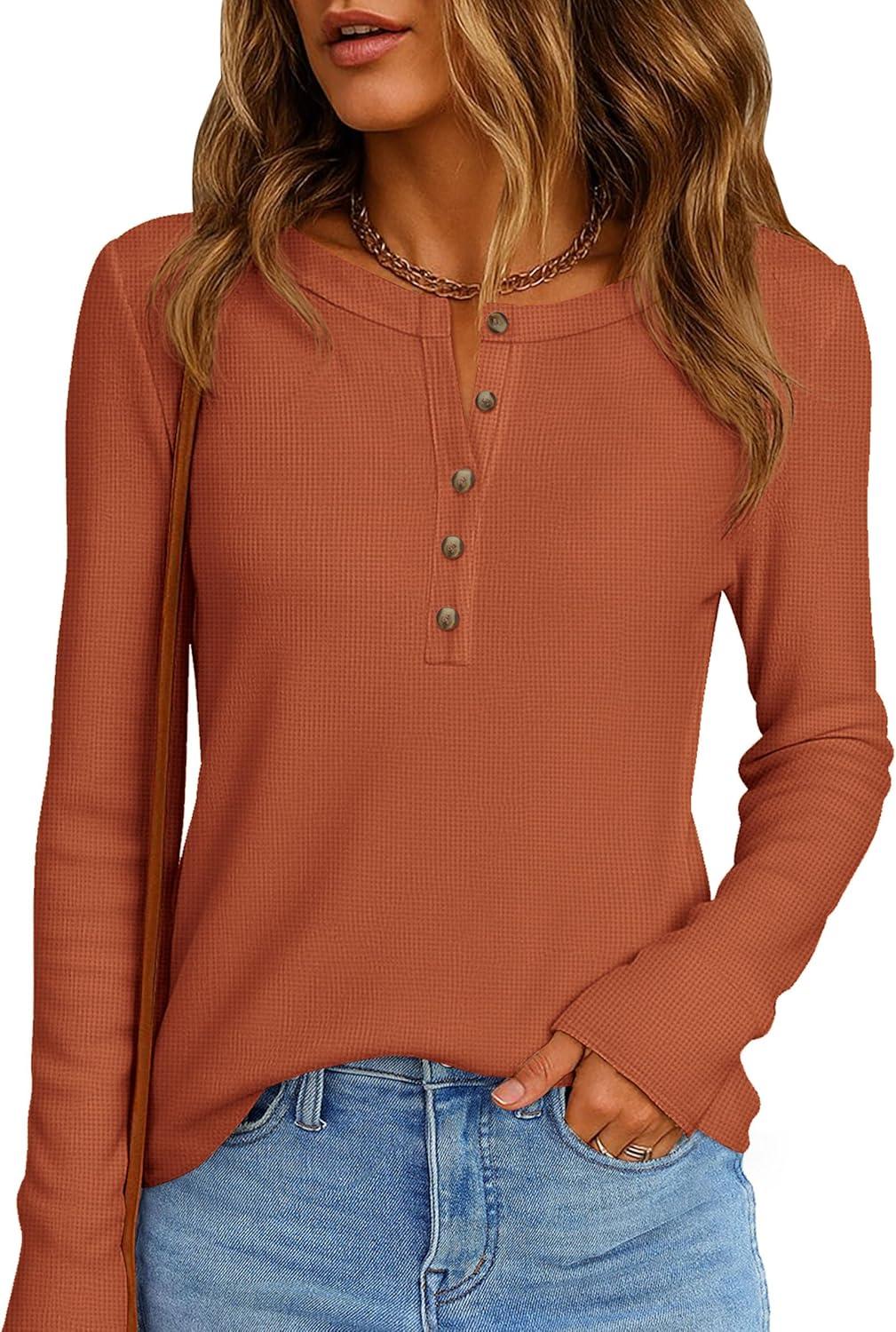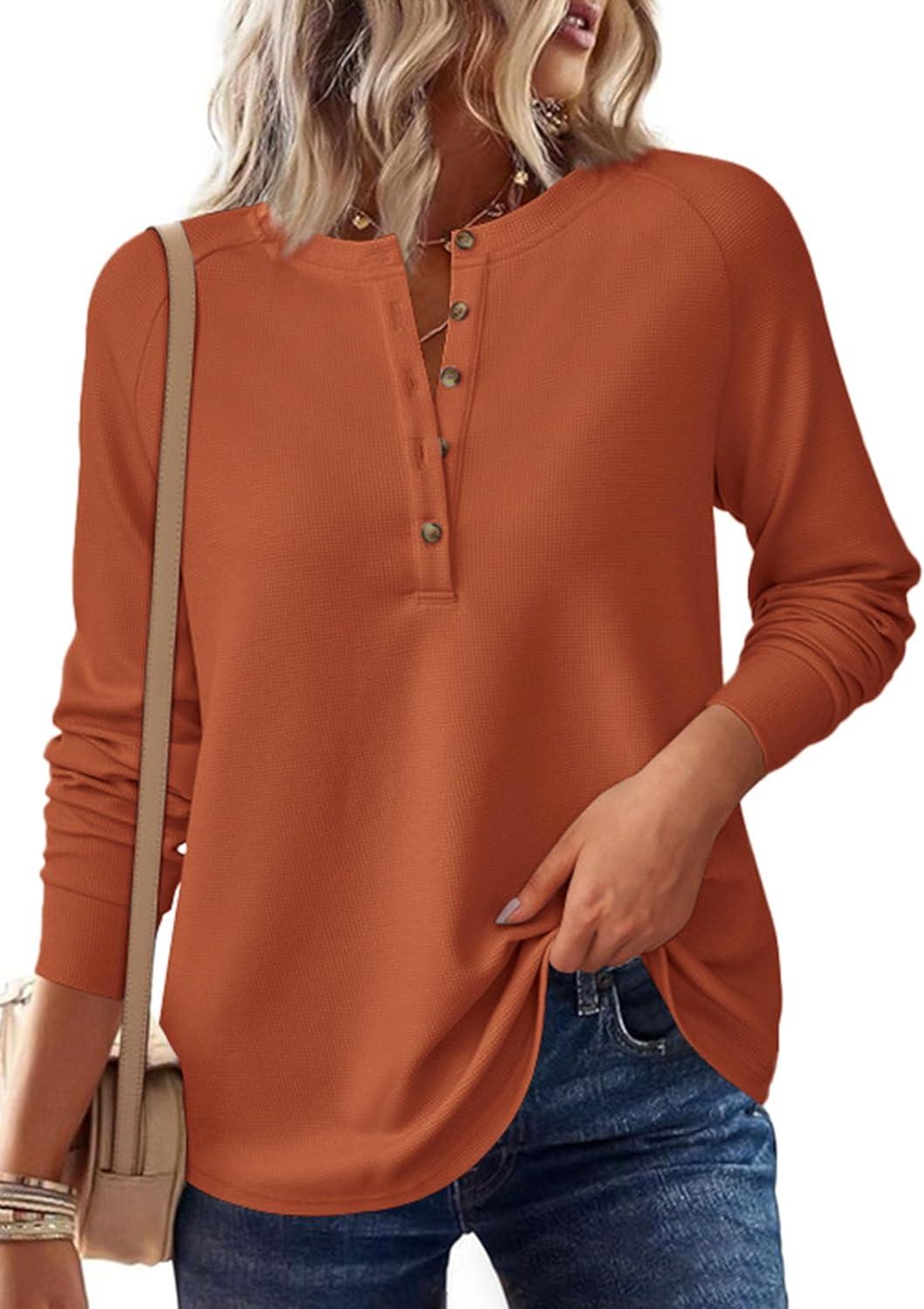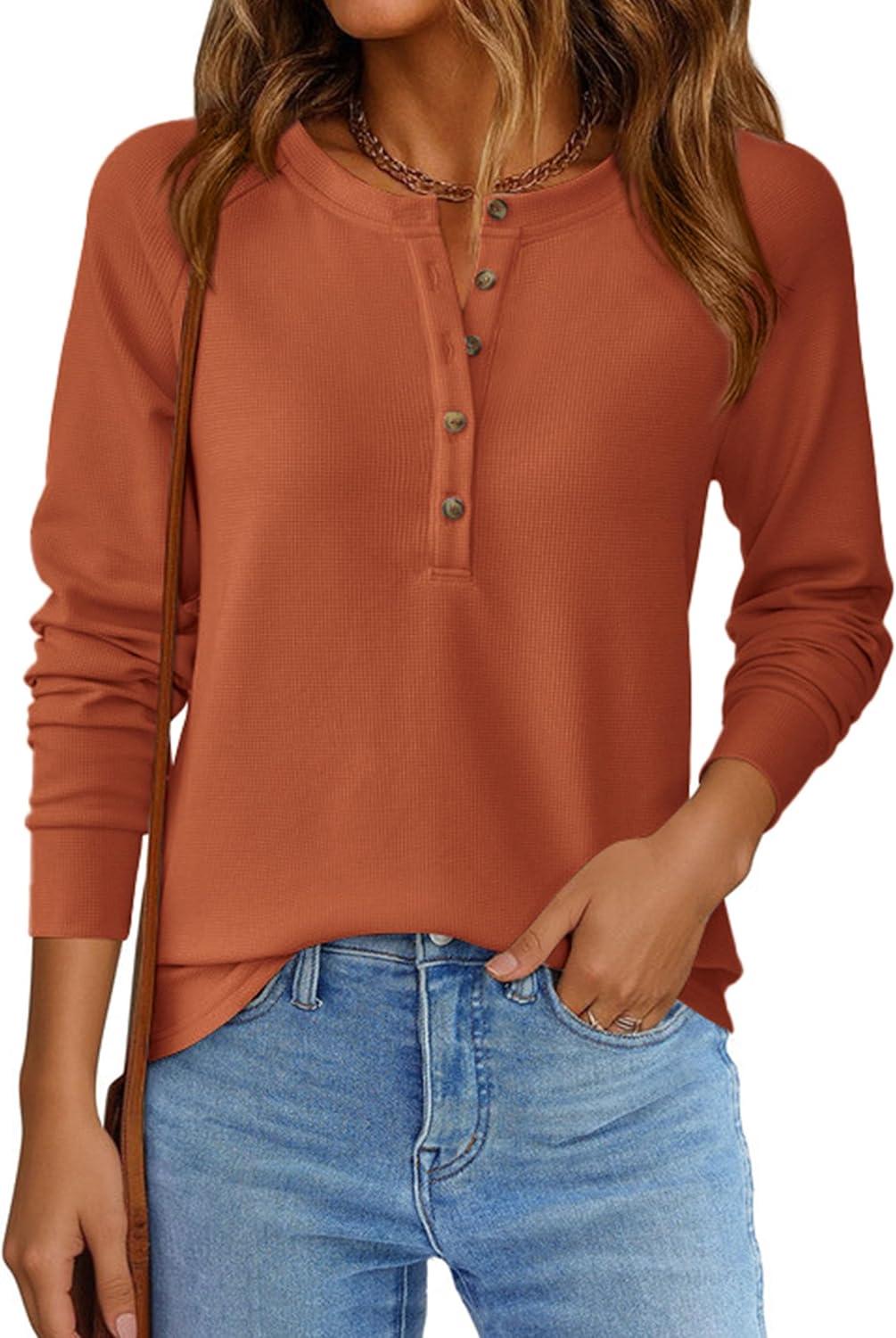 PRETTYGARDEN Women Long Sleeve Waffle Knit Shirts 2026 Fall Casual Button V Neck Loose Henley Tops Basic Tees Winter Clothes(Burnt Orange)