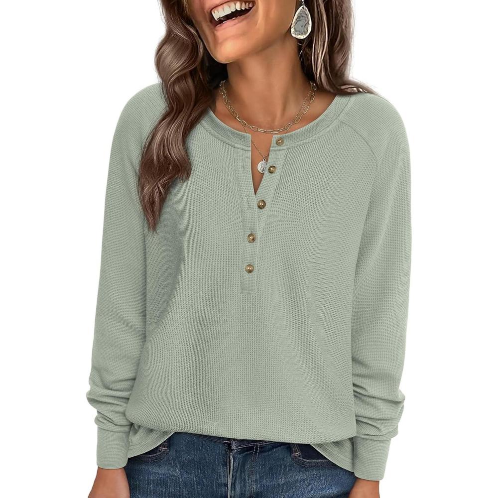 PRETTYGARDEN Women Long Sleeve Waffle Knit Shirts 2026 Fall Casual Button V Neck Loose Henley Tops Basic Tees Winter Clothes(Sage Green)