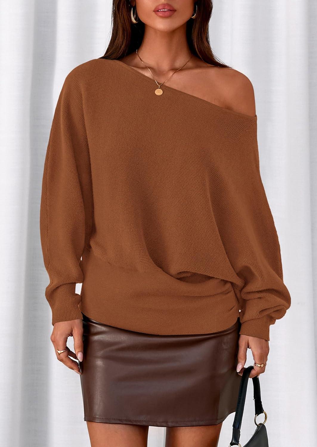 PRETTYGARDEN Women Off The Shoulder Sweater 2025 Fall Trendy Long Batwing Sleeve Knit Pullover Going Out Tops Winter Clothing(Caramel)