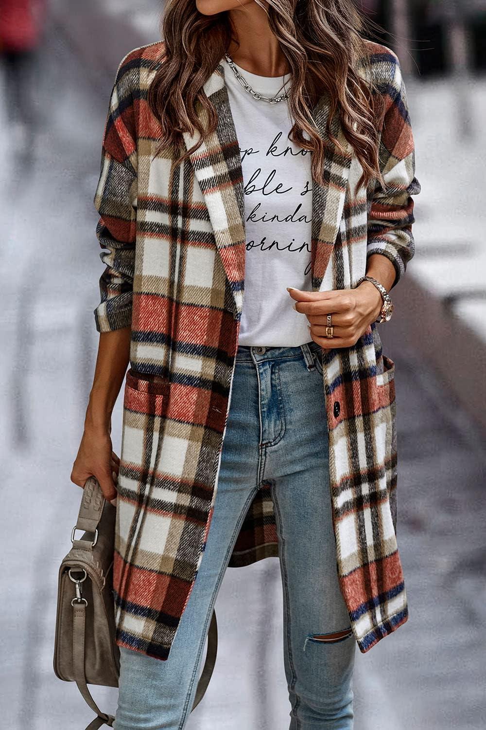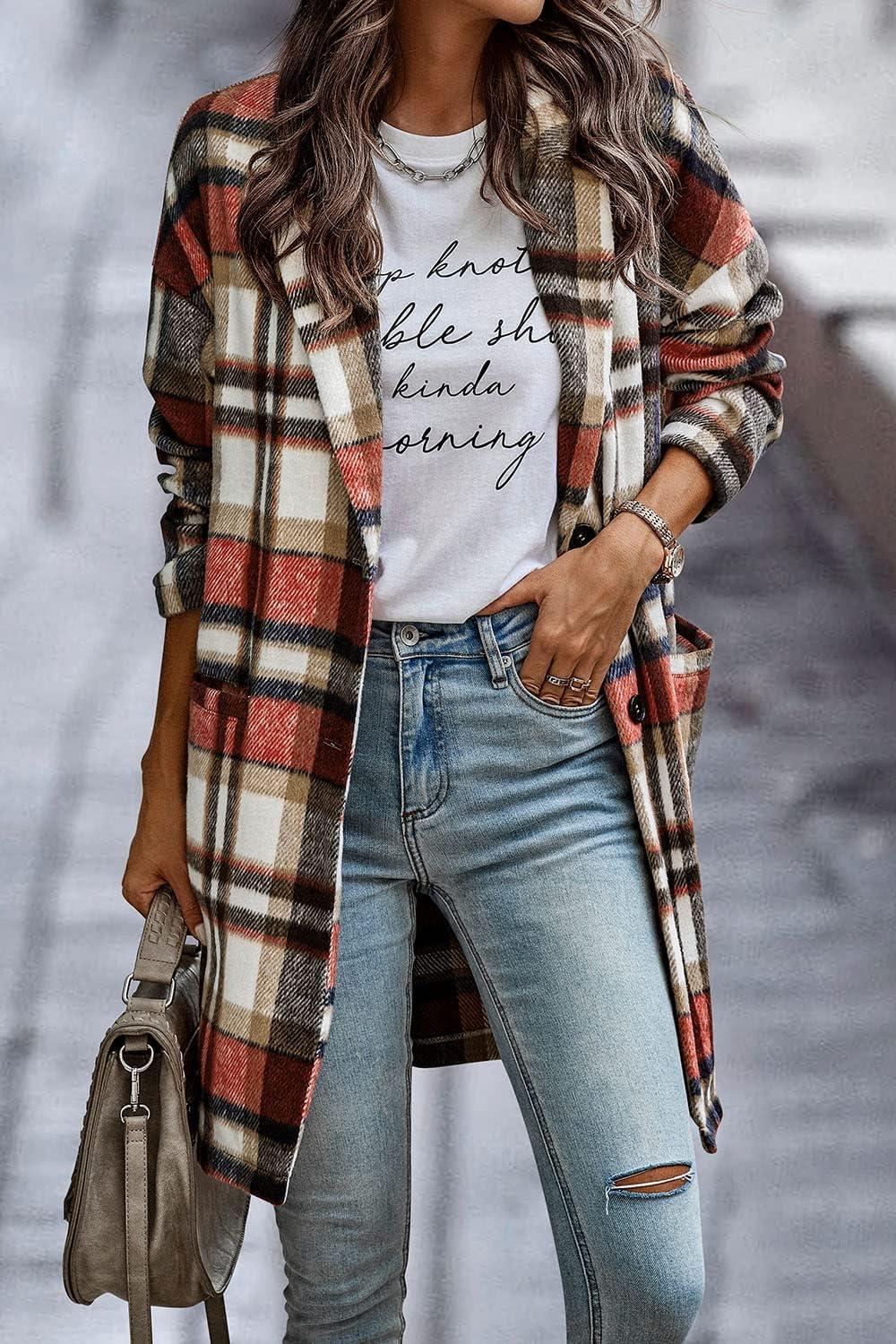 PRETTYGARDEN Women Plaid Shacket Jacket Trendy Fall Casual Button Wool Blend Tartan Trench Coat Winter Clothing with Pockets(Brick Red)