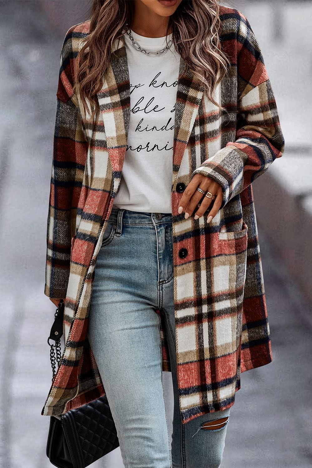 PRETTYGARDEN Women Plaid Shacket Jacket Trendy Fall Casual Button Wool Blend Tartan Trench Coat Winter Clothing with Pockets(Brilliant Red)