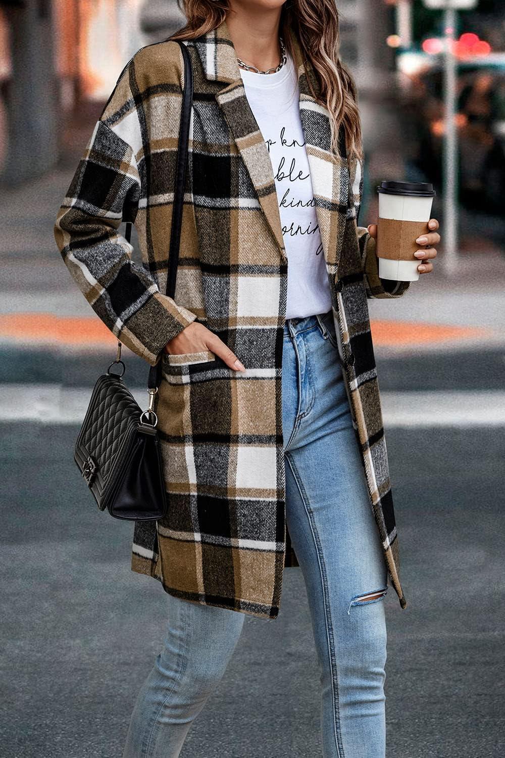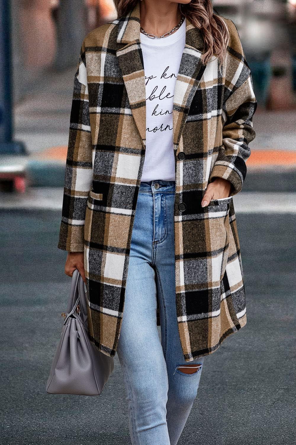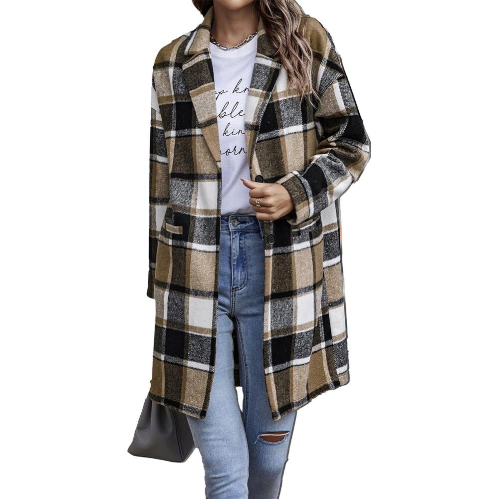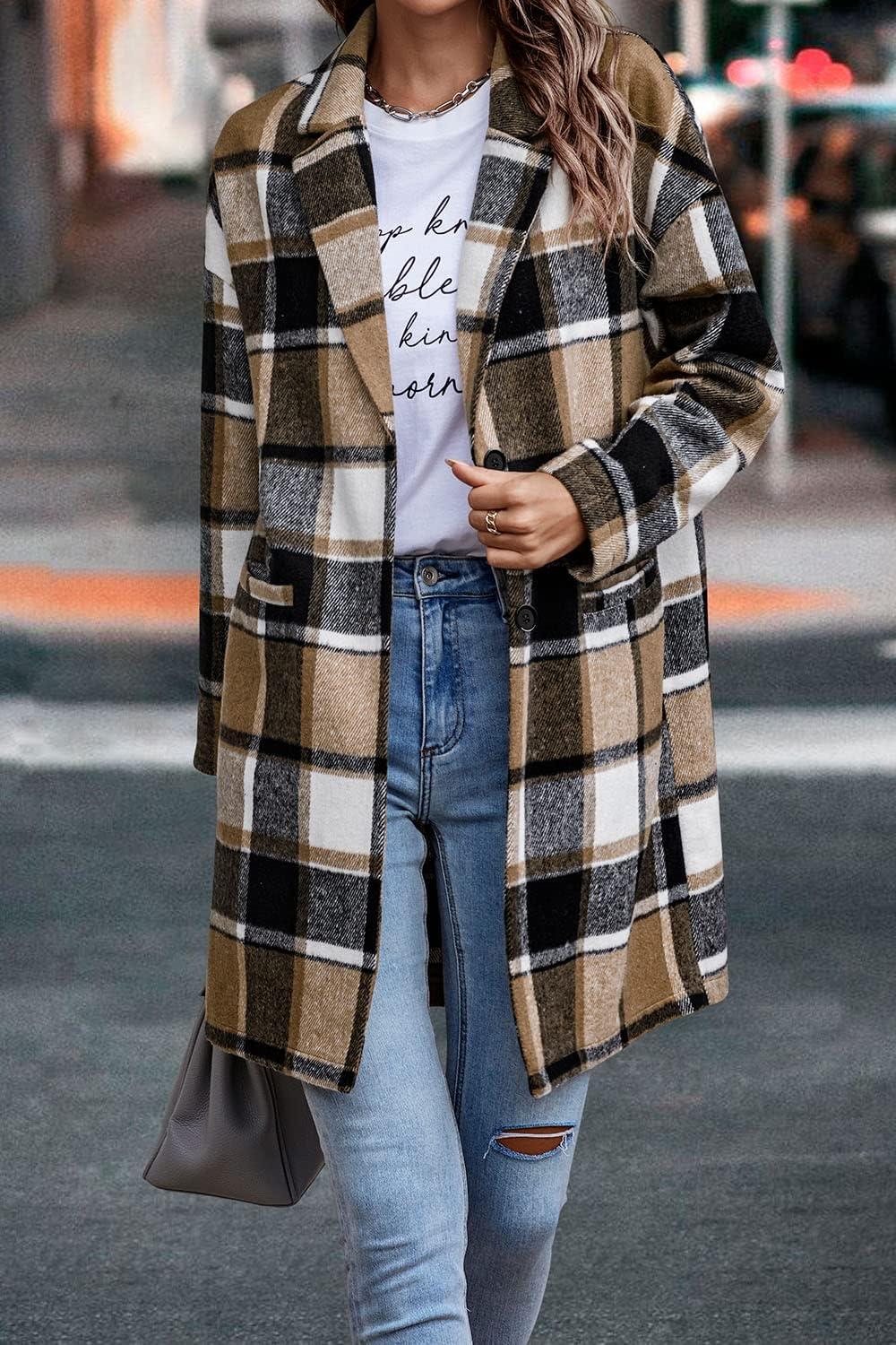 PRETTYGARDEN Women Plaid Shacket Jacket Trendy Fall Casual Button Wool Blend Tartan Trench Coat Winter Clothing with Pockets(Khaki)