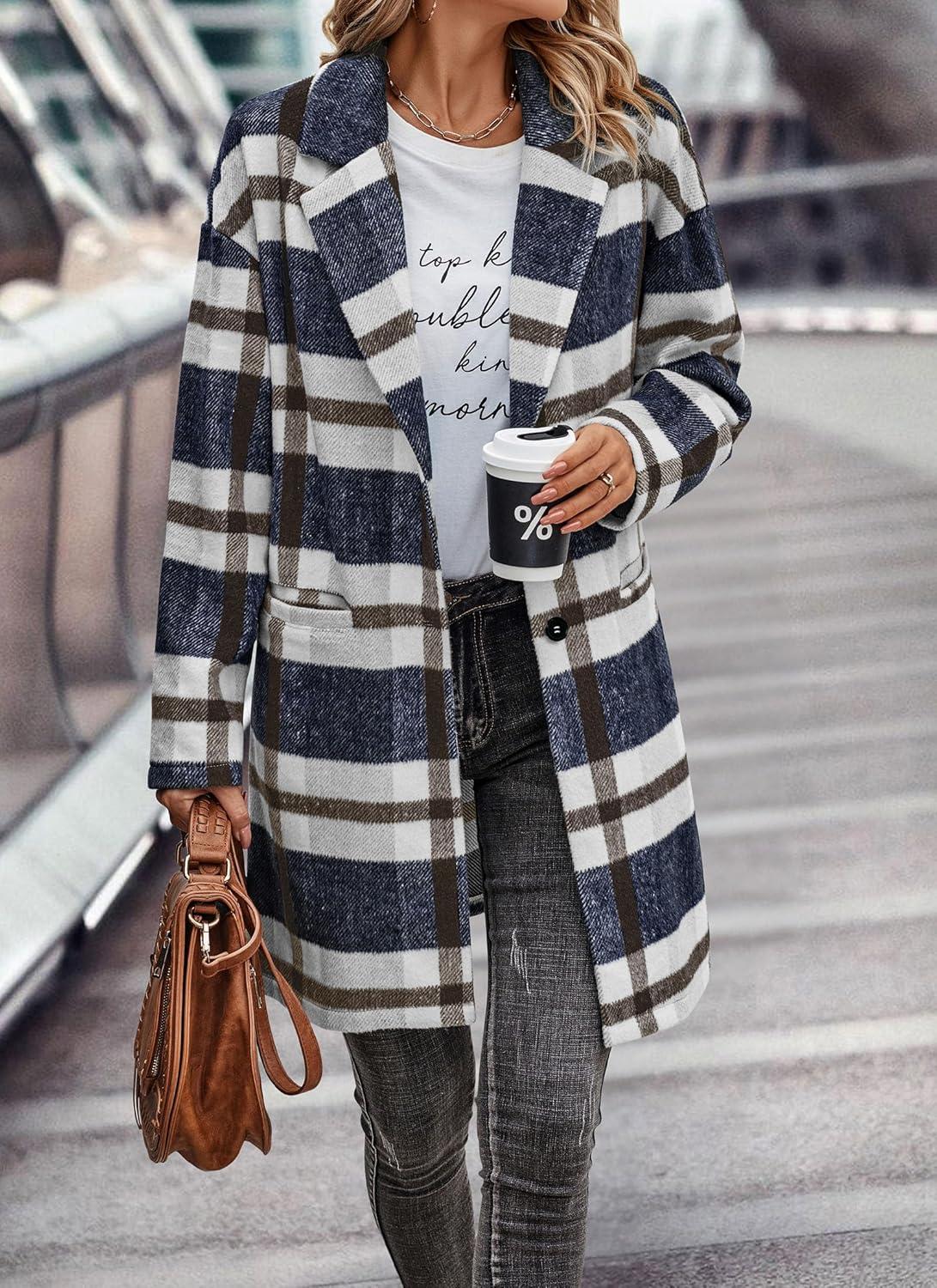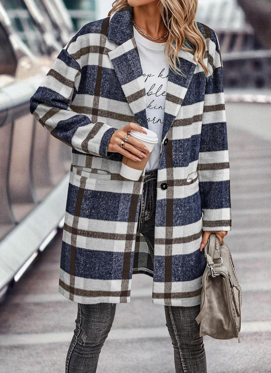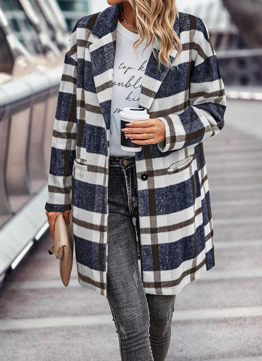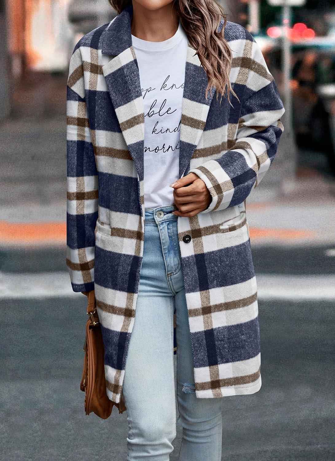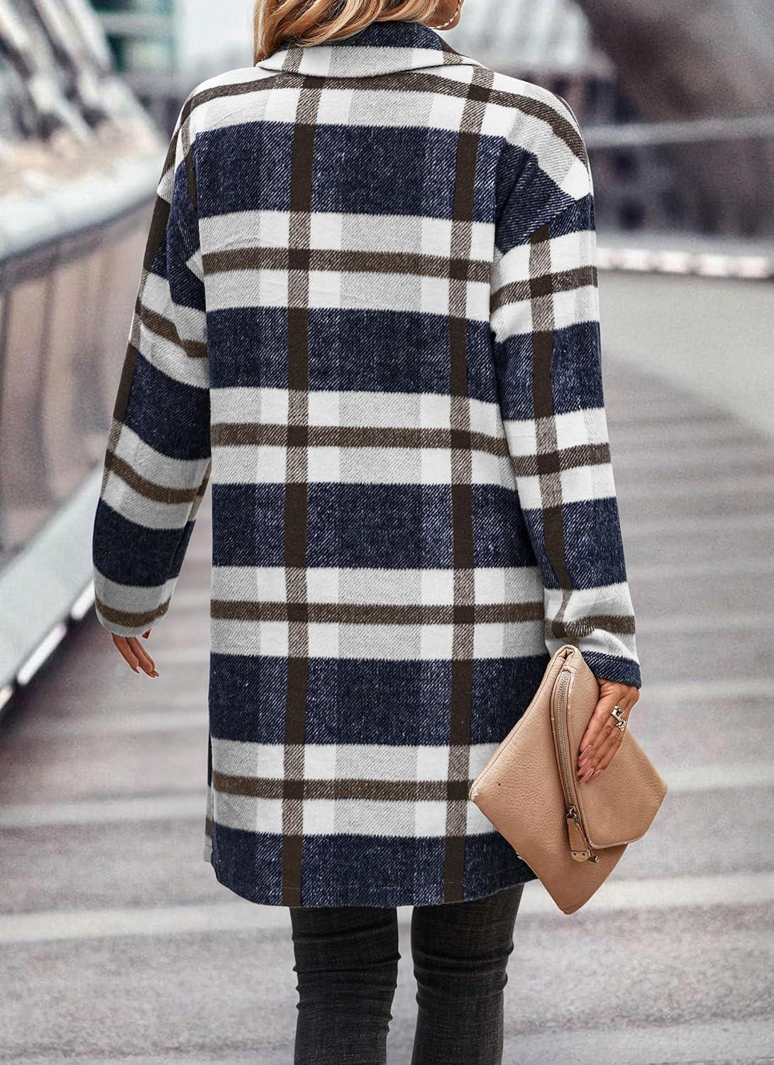PRETTYGARDEN Women Plaid Shacket Jacket Trendy Fall Casual Button Wool Blend Tartan Trench Coat Winter Clothing with Pockets(Navy White)