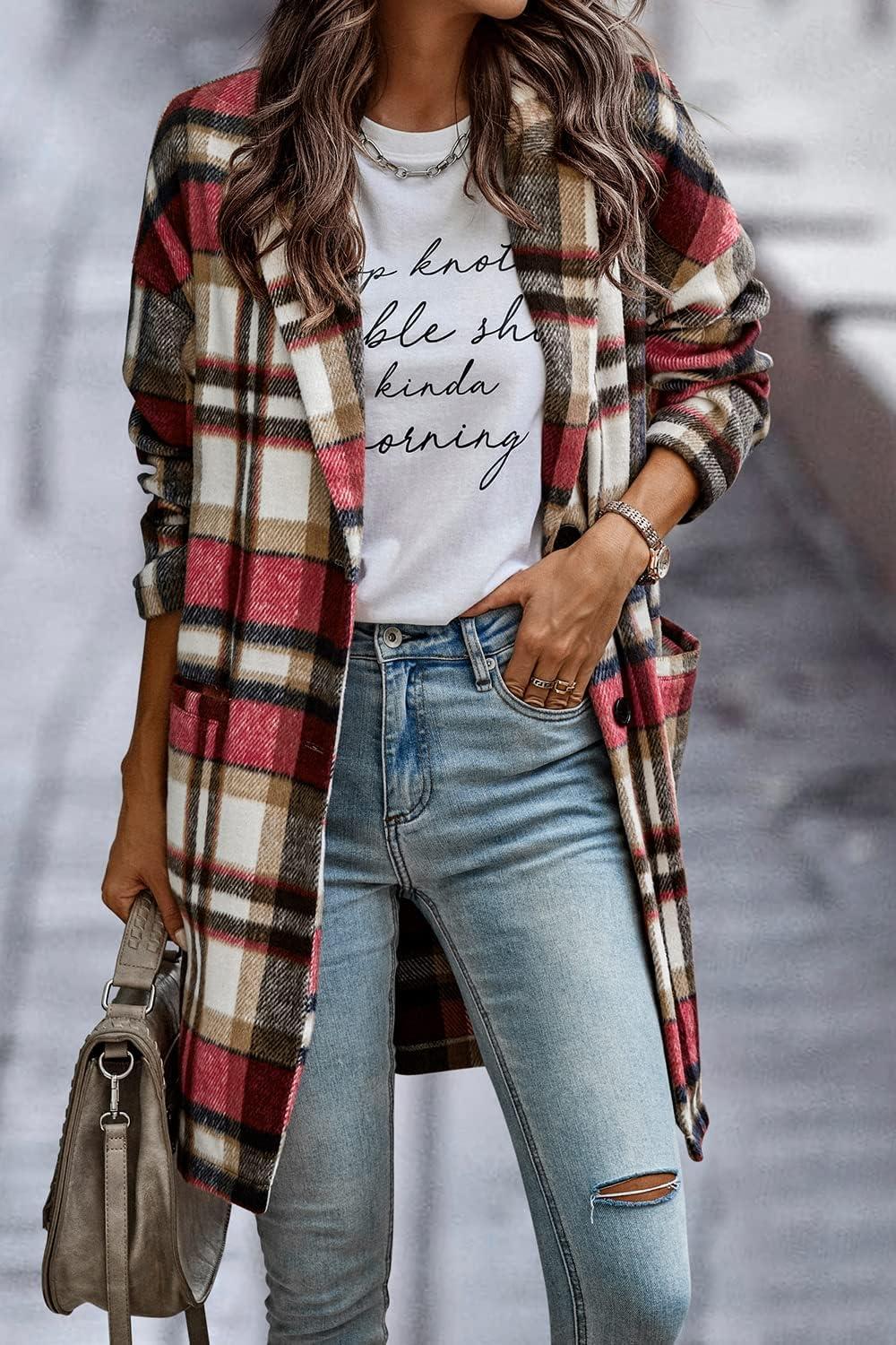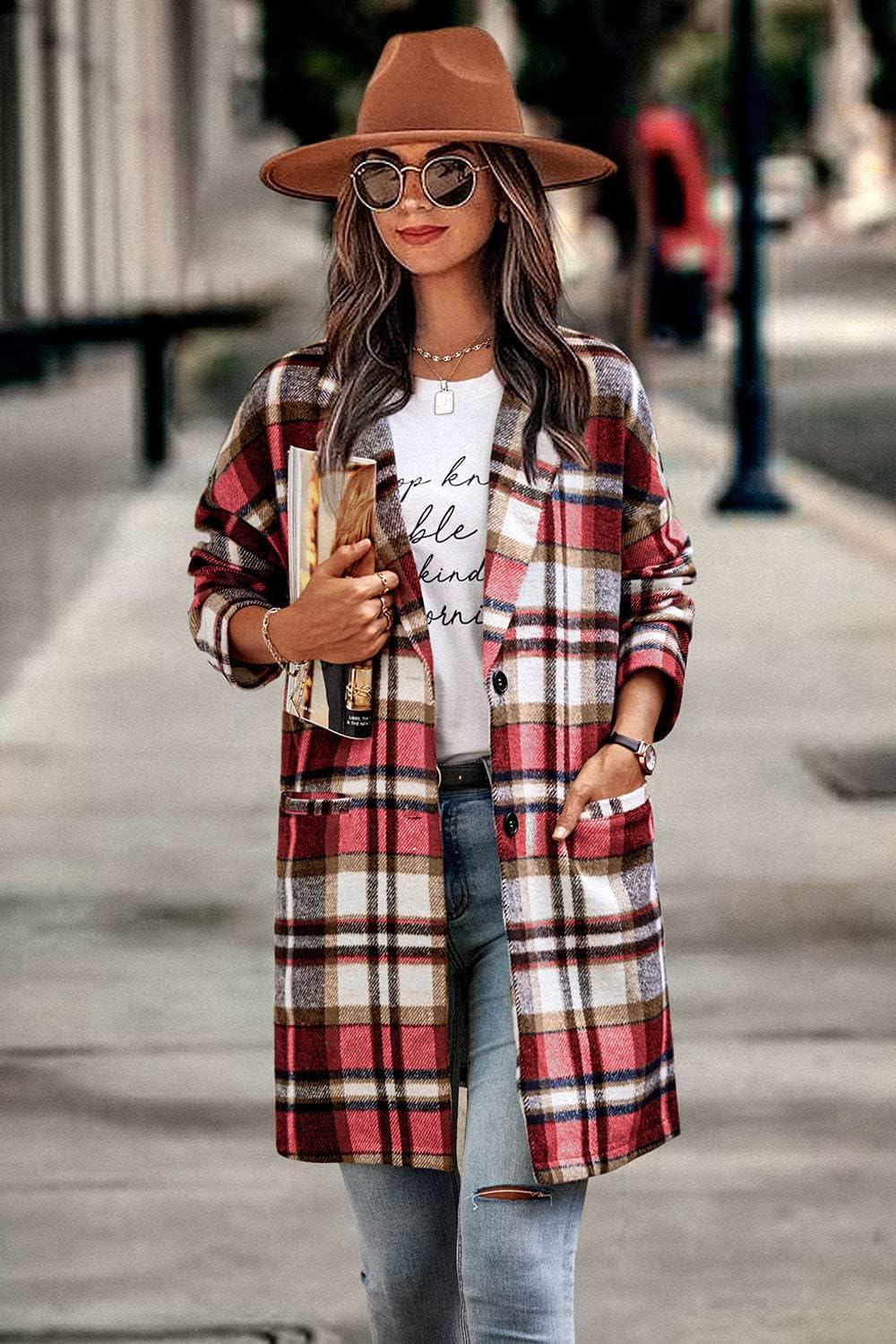 PRETTYGARDEN Women Plaid Shacket Jacket Trendy Fall Casual Button Wool Blend Tartan Trench Coat Winter Clothing with Pockets(Red)