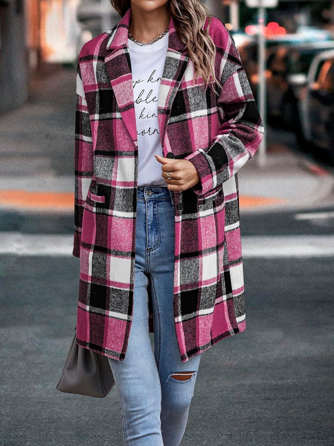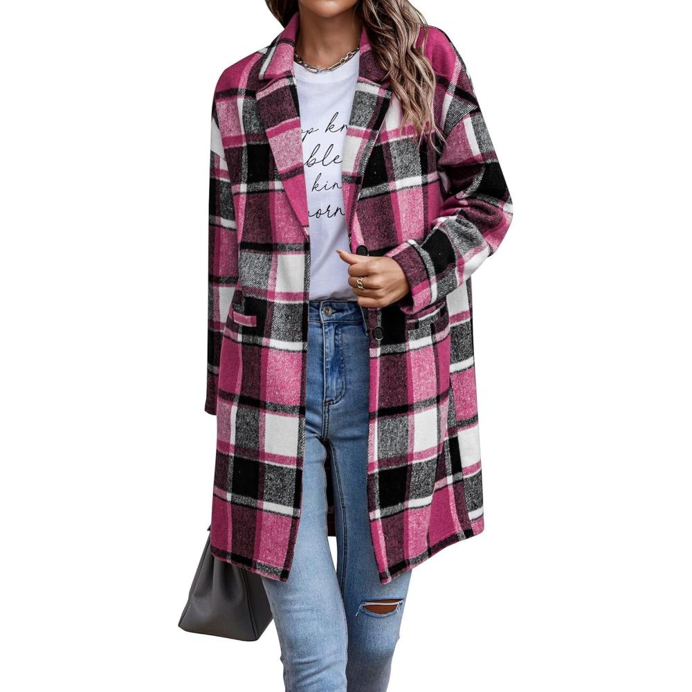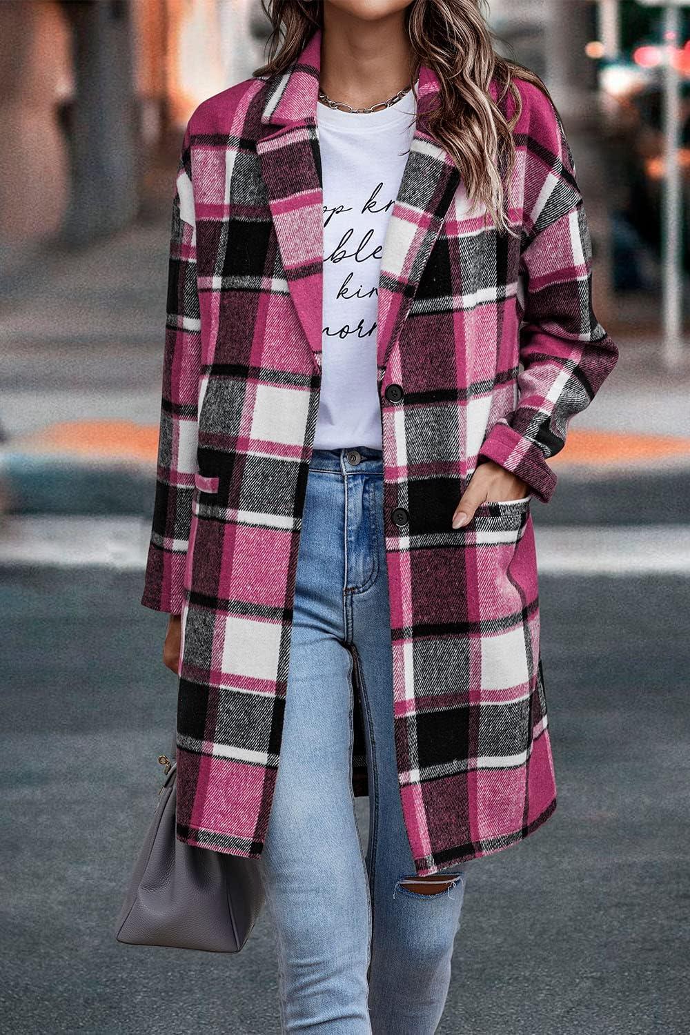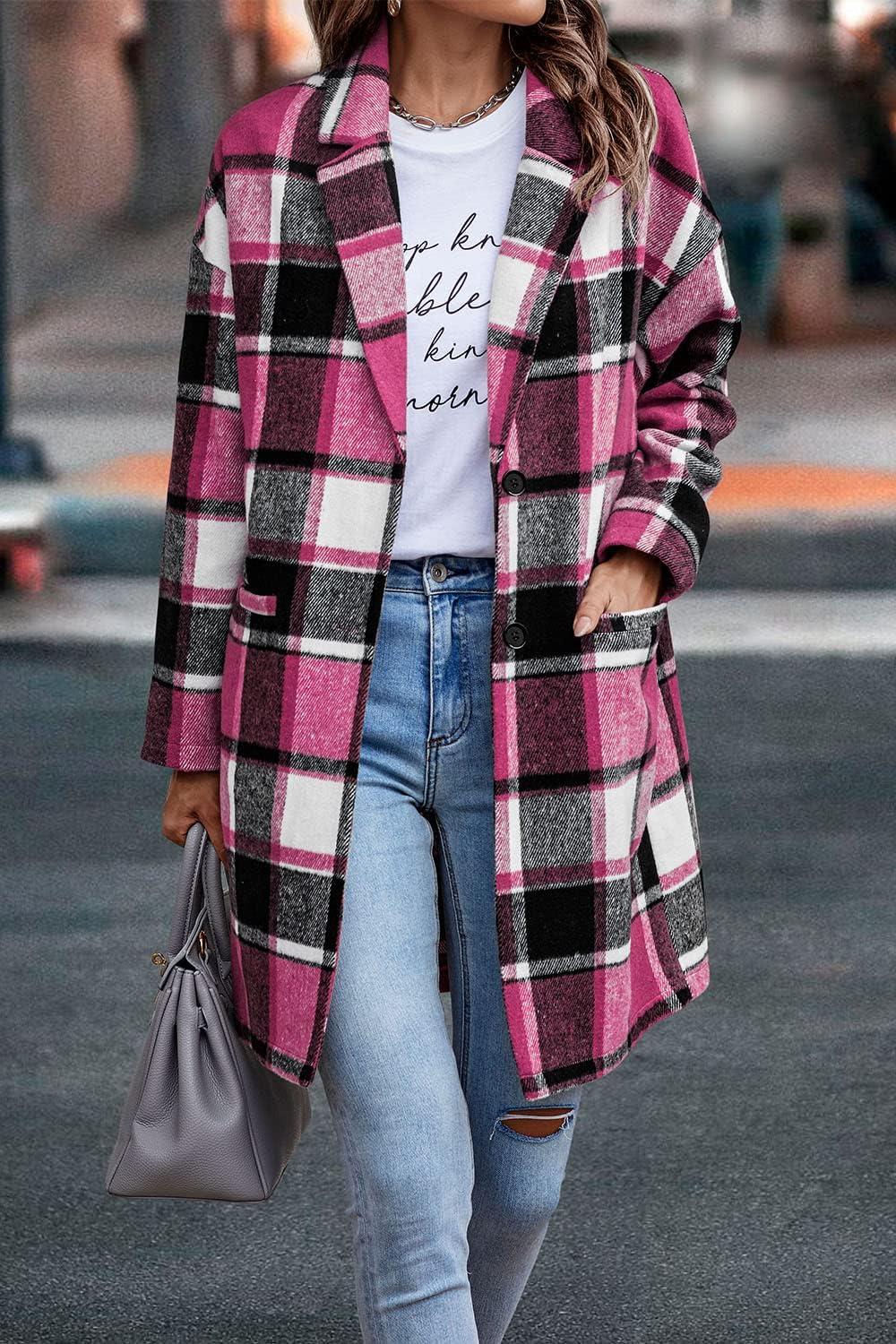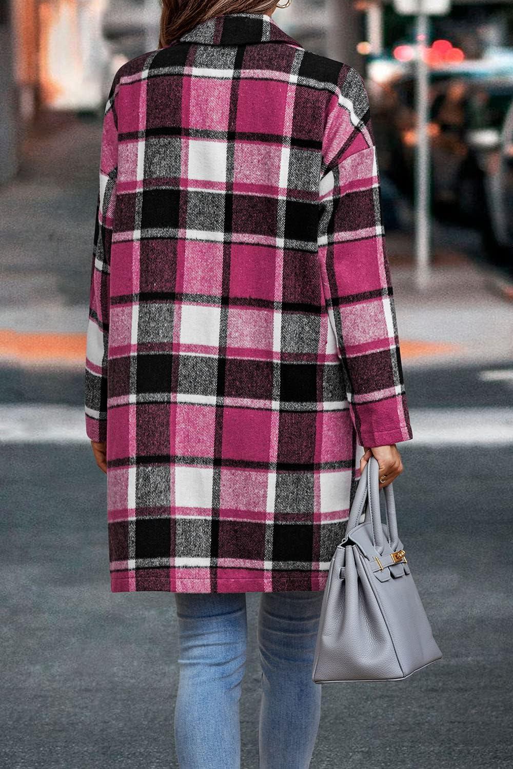 PRETTYGARDEN Women Plaid Shacket Jacket Trendy Fall Casual Button Wool Blend Tartan Trench Coat Winter Clothing with Pockets(Rose Red)
