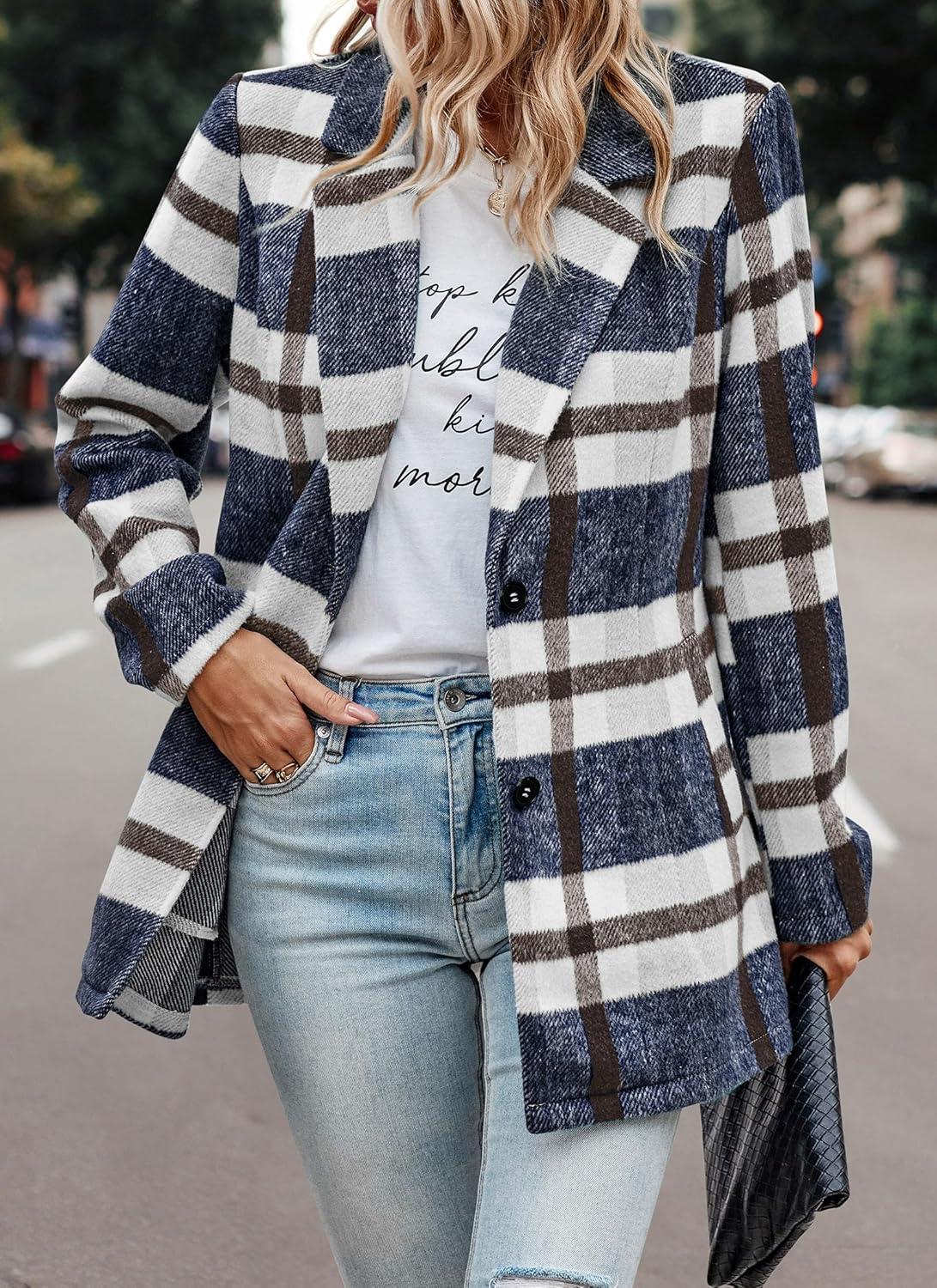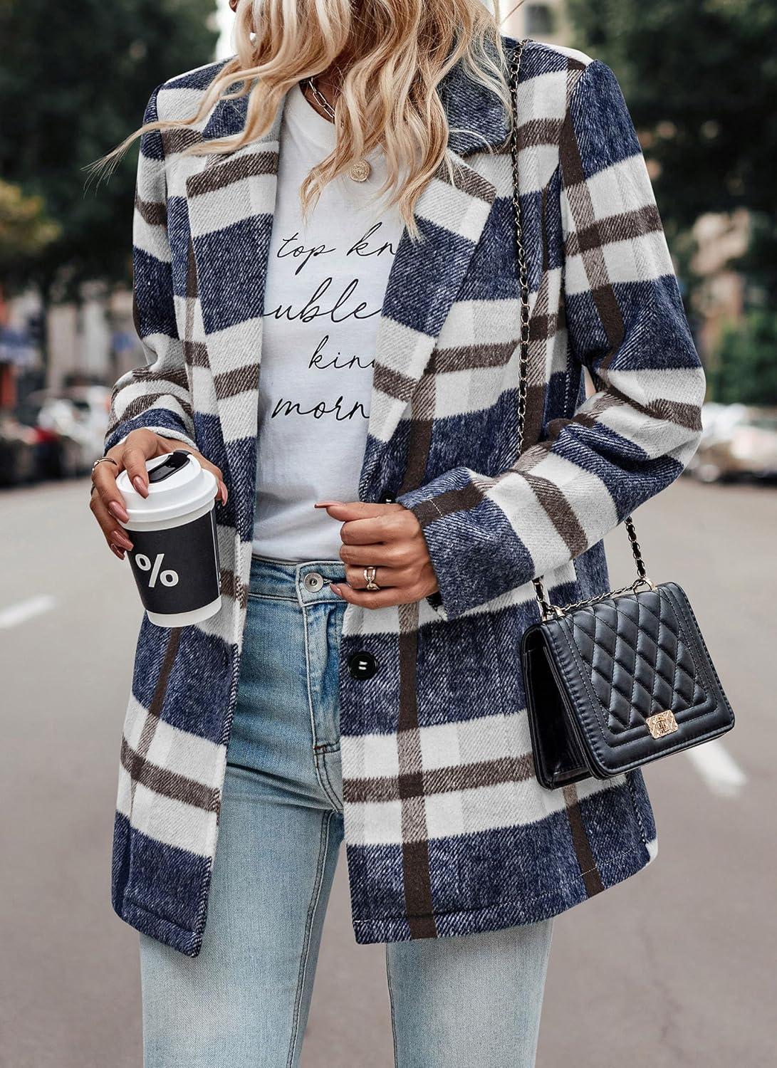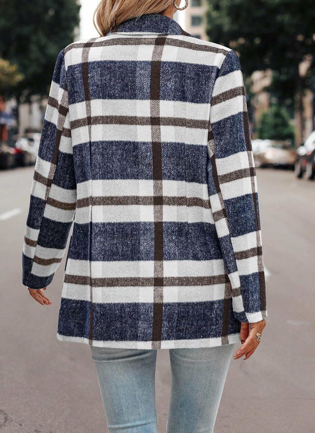 PRETTYGARDEN Women Plaid Shacket Jacket Trendy Fall Casual Button Wool Blend Tartan Trench Coat Winter Clothing with Pockets(Short Style Navy Plaid)