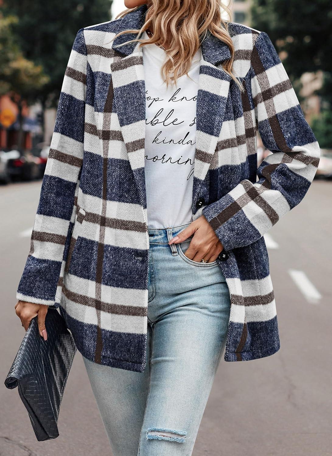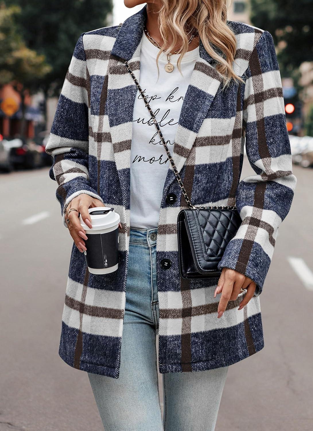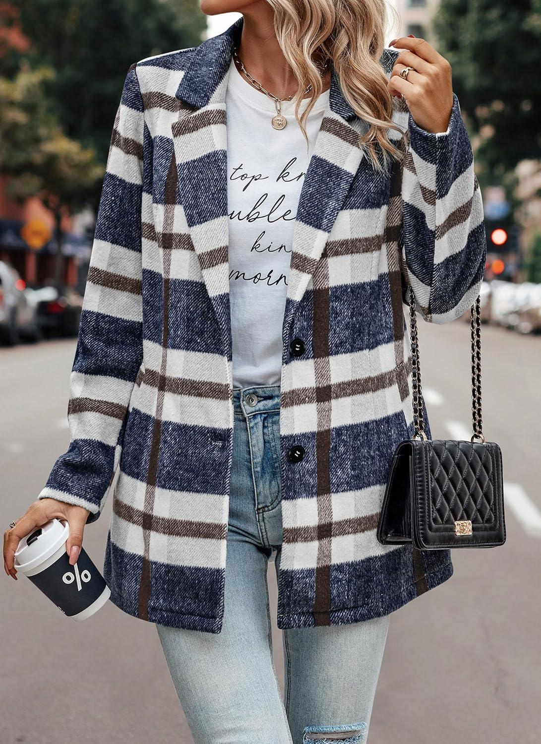 PRETTYGARDEN Women Plaid Shacket Jacket Trendy Fall Casual Button Wool Blend Tartan Trench Coat Winter Clothing with Pockets(Short Style Navy Plaid)
