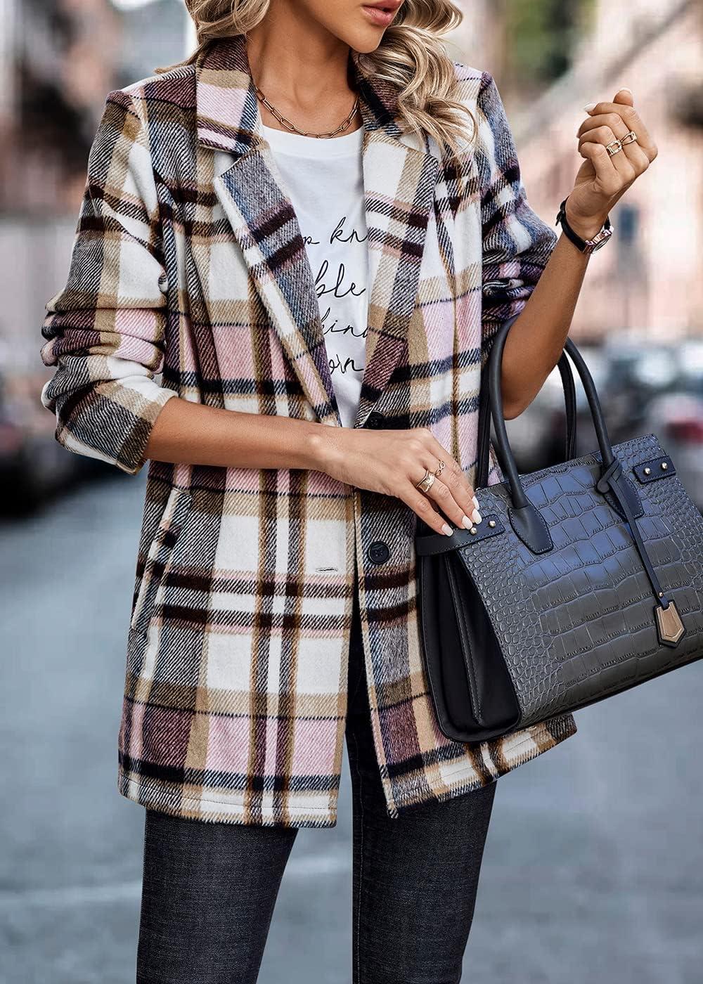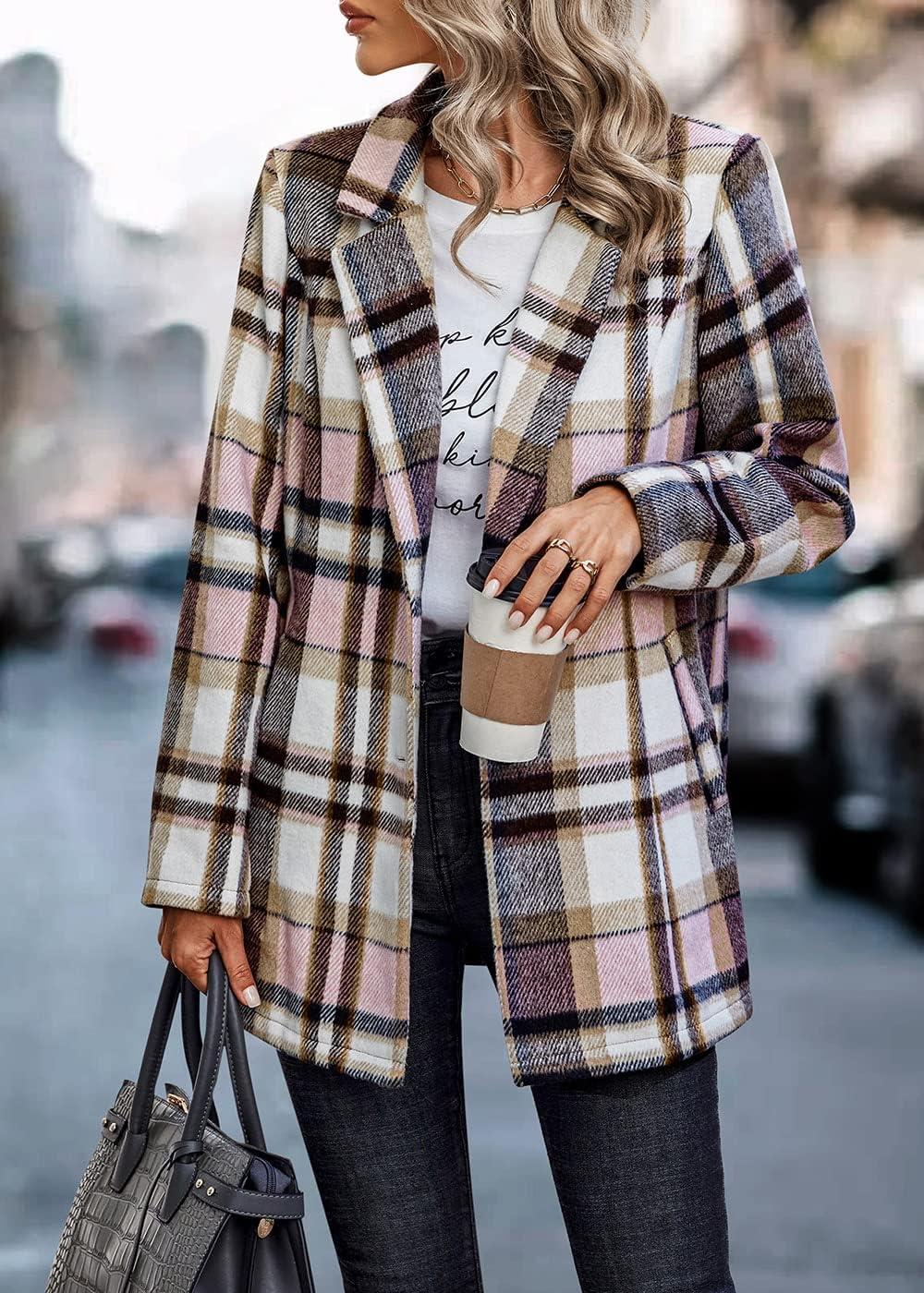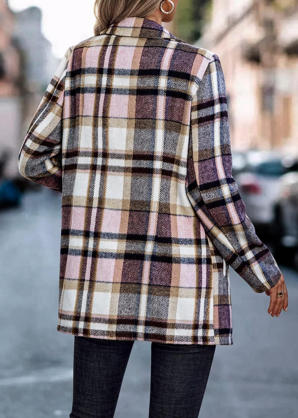 PRETTYGARDEN Women Plaid Shacket Jacket Trendy Fall Casual Button Wool Blend Tartan Trench Coat Winter Clothing with Pockets(Short Style Pink White)