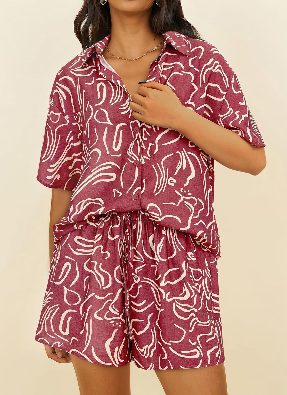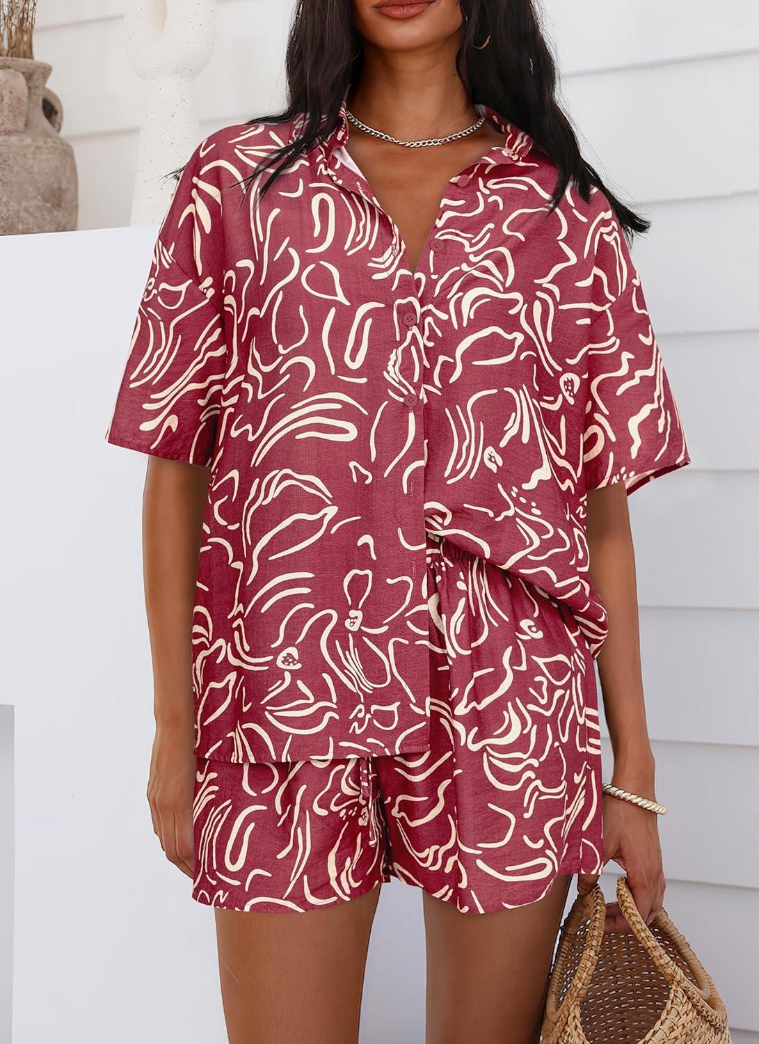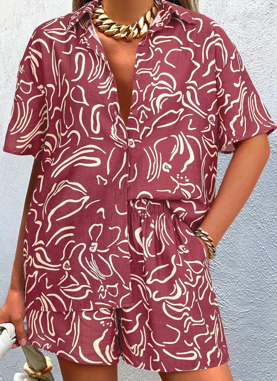 PRETTYGARDEN Women Summer 2 Piece Beach Outfits Printed Short Sleeve Tops Lounge Shorts Casual Tracksuit Set(Brown Red)