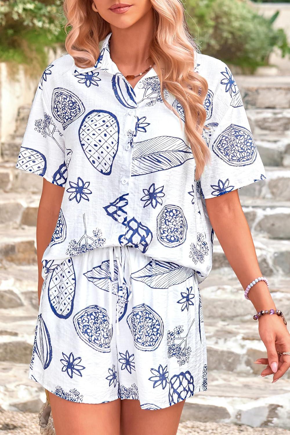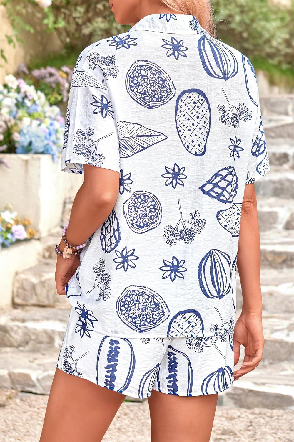 PRETTYGARDEN Women Summer 2 Piece Beach Outfits Printed Short Sleeve Tops Lounge Shorts Casual Tracksuit Set(White Blue)