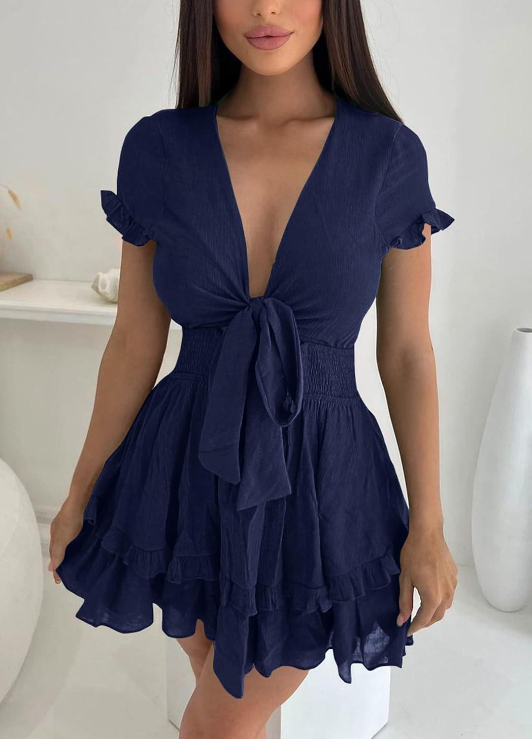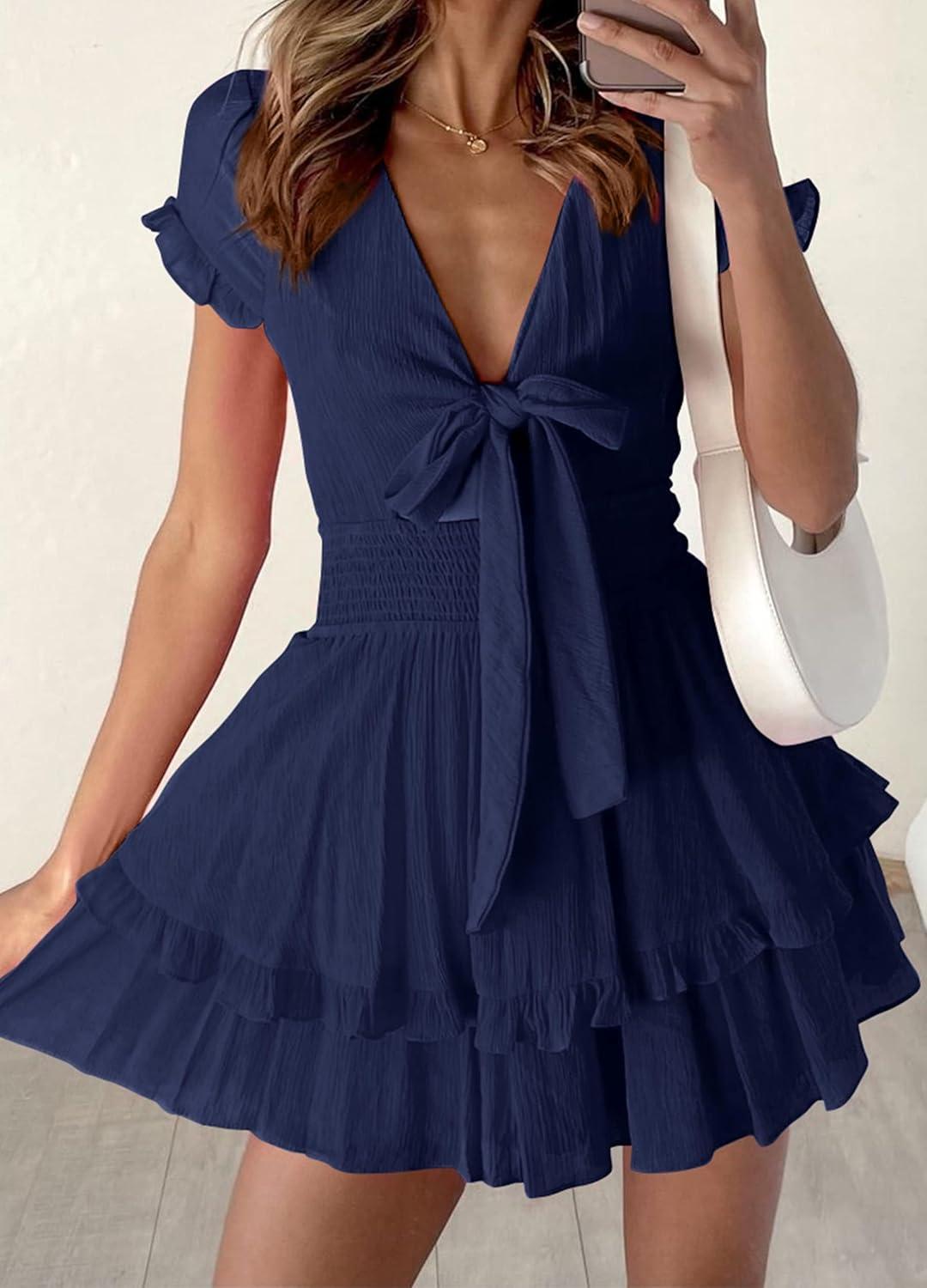 PRETTYGARDEN Women Summer Short Dress 2025 Casual V Neck Short Sleeve Tiered Bow Mini Sun Dresses Beach Vacation Sundress(Navy)
