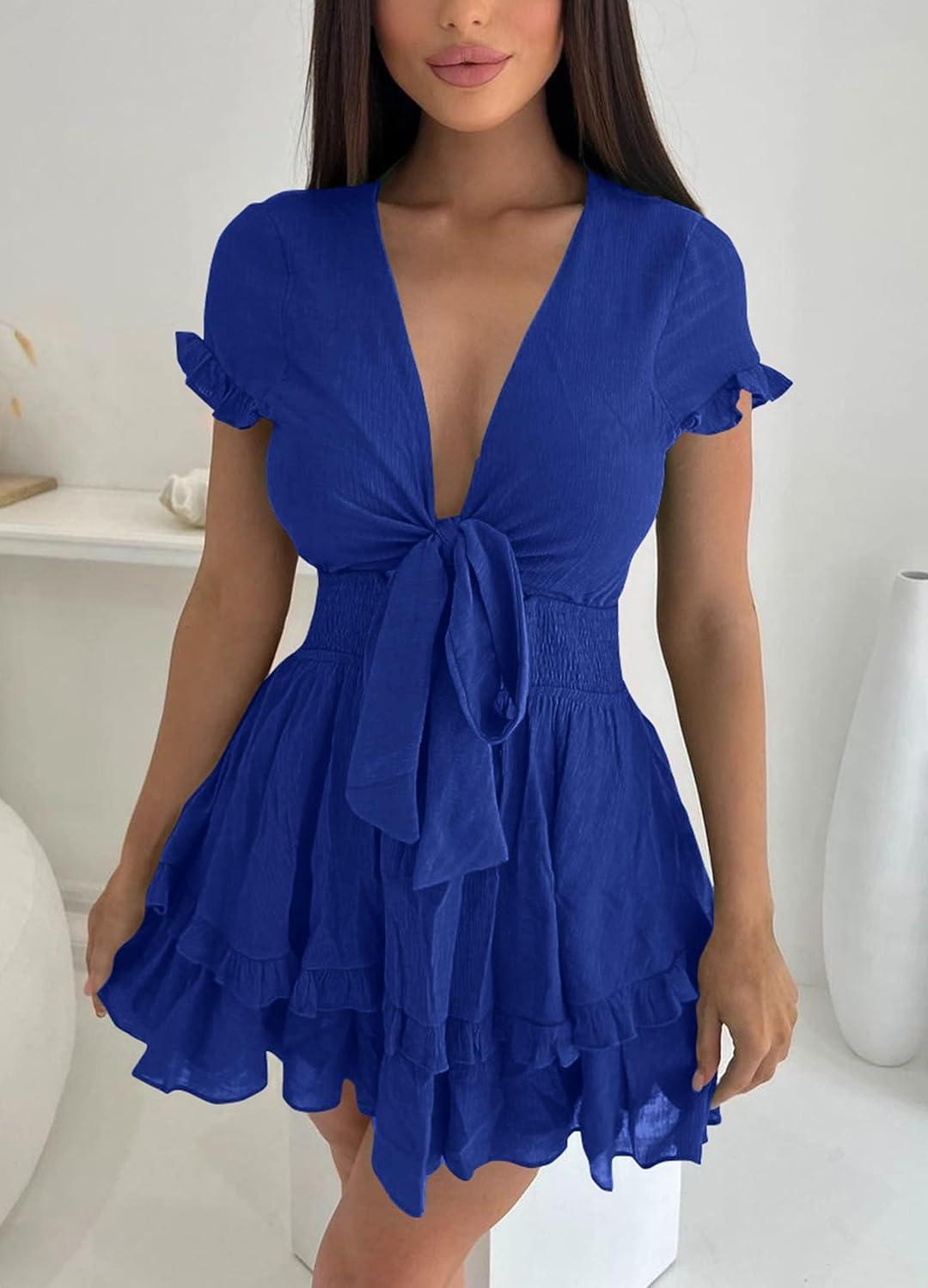 PRETTYGARDEN Women Summer Short Dress 2025 Casual V Neck Short Sleeve Tiered Bow Mini Sun Dresses Beach Vacation Sundress(Royal Blue)