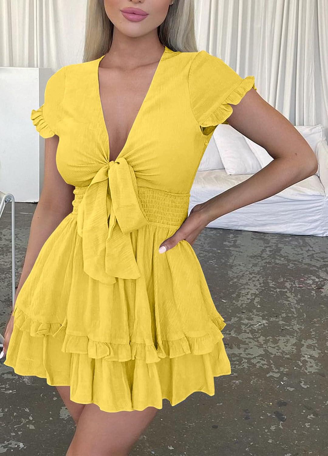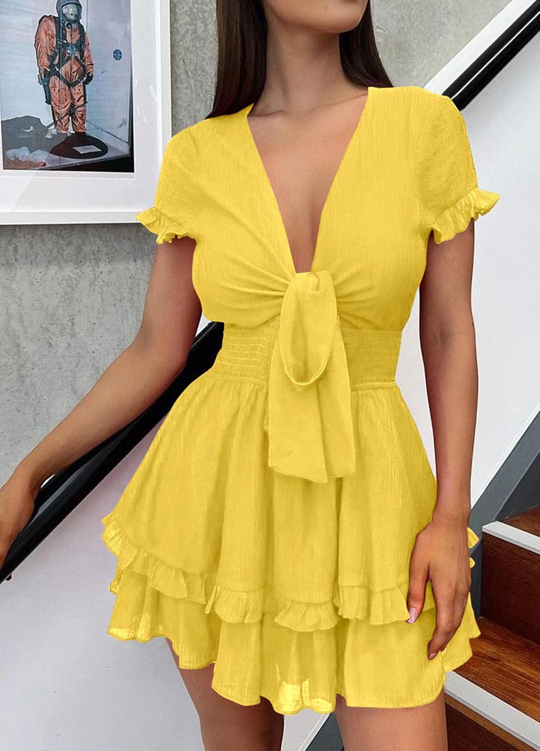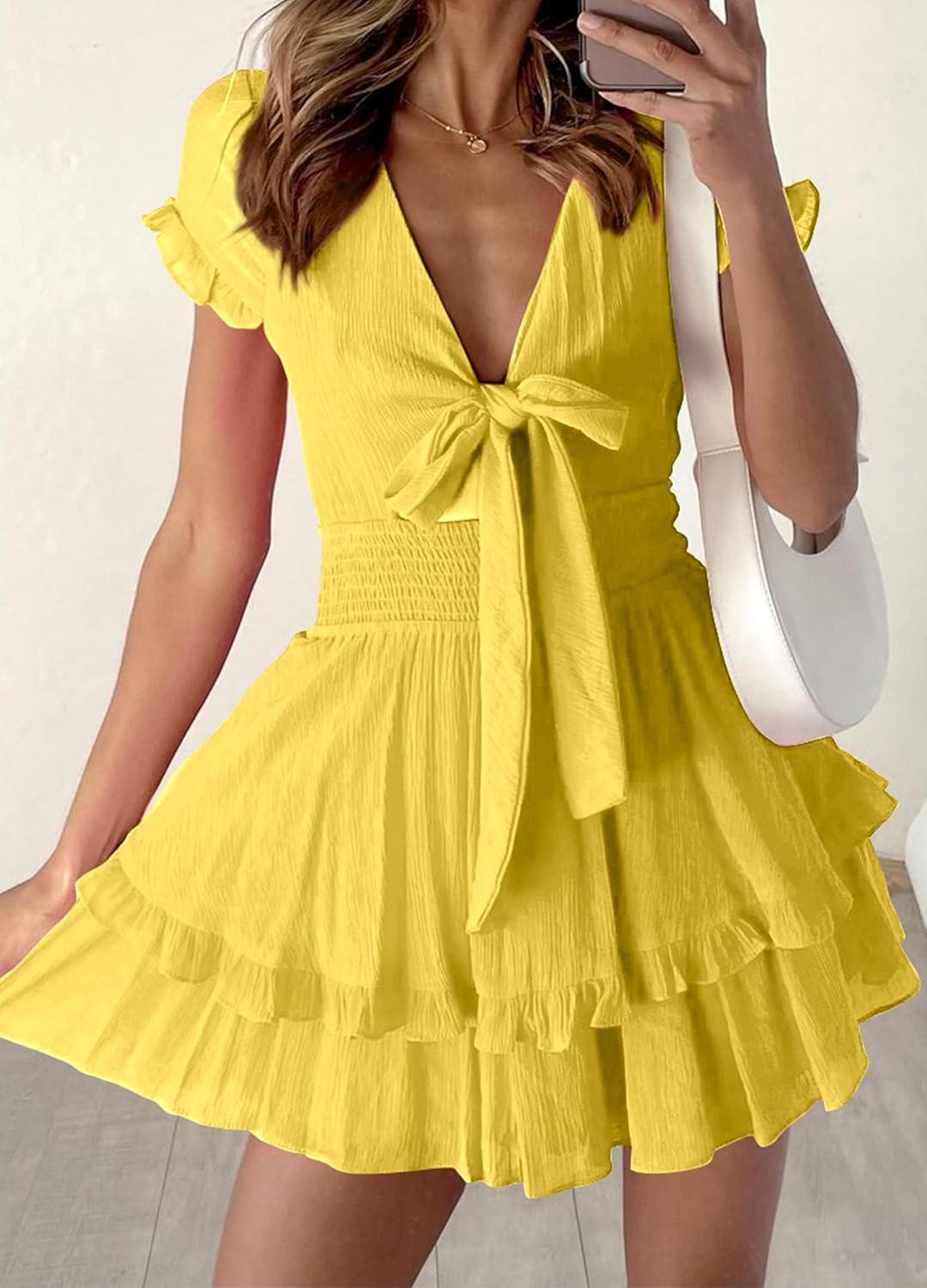 PRETTYGARDEN Women Summer Short Dress 2025 Casual V Neck Short Sleeve Tiered Bow Mini Sun Dresses Beach Vacation Sundress(Yellow)