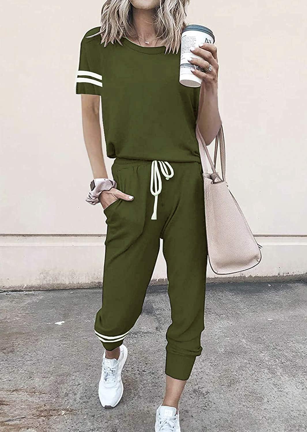 imagePRETTYGARDEN Women Summer Two Piece Outfits Striped Short Sleeve Pullover and Long Pants Tracksuit Travel Pajama Lounge SetArmy Green