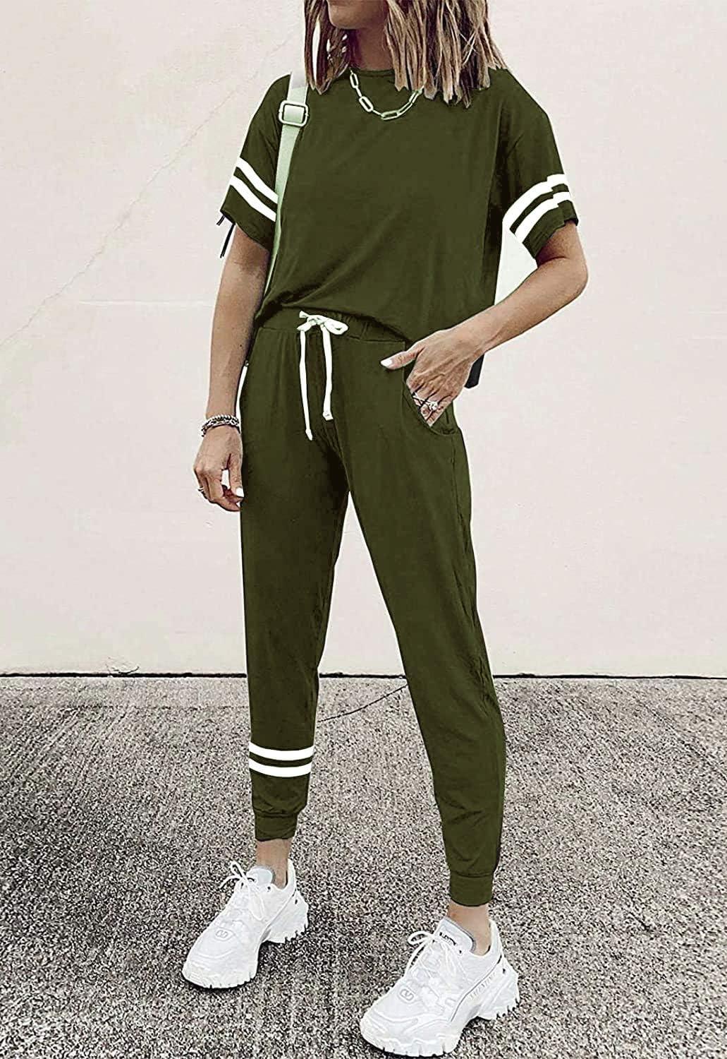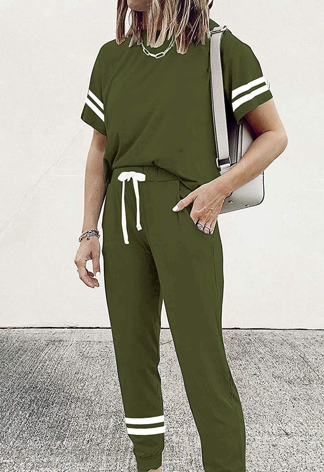PRETTYGARDEN Women Summer Two Piece Outfits Striped Short Sleeve Pullover and Long Pants Tracksuit Travel Pajama Lounge Set(Army Green)