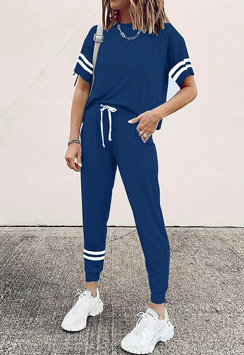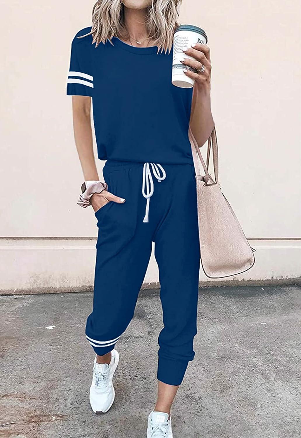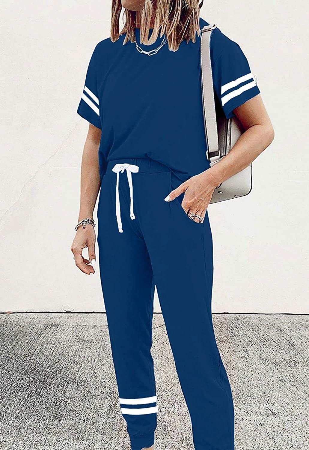 PRETTYGARDEN Women Summer Two Piece Outfits Striped Short Sleeve Pullover and Long Pants Tracksuit Travel Pajama Lounge Set(Dark Blue)