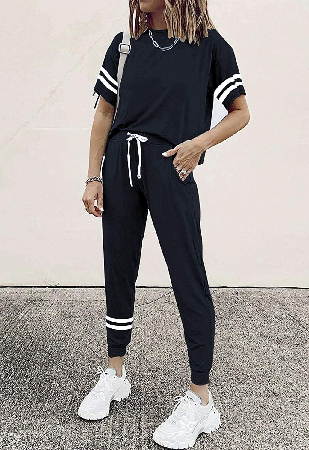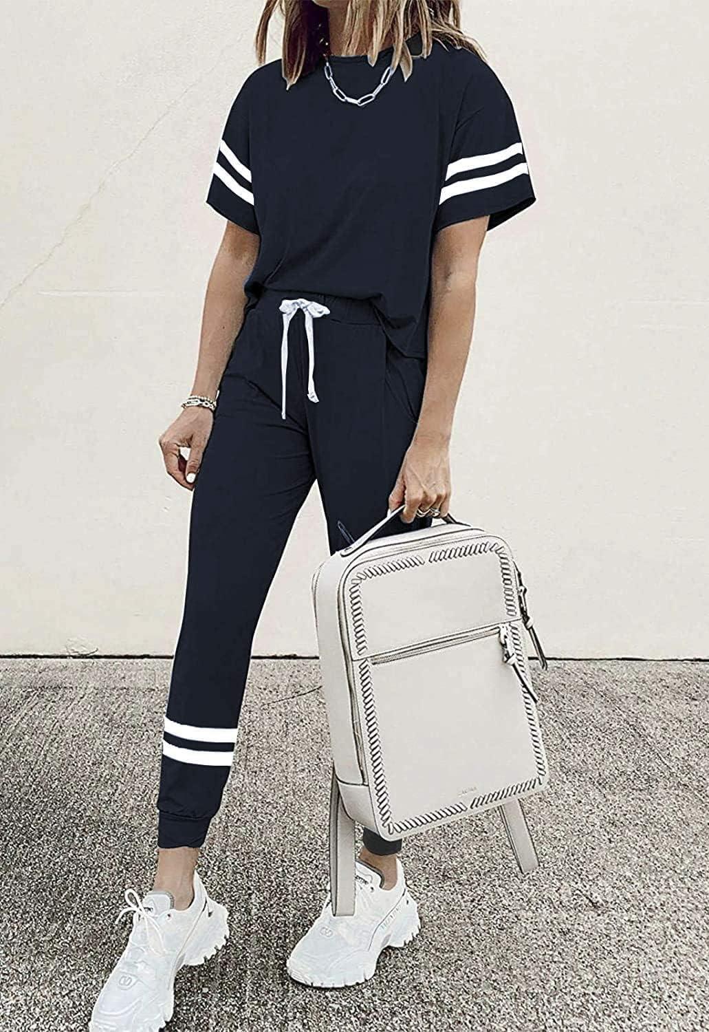 PRETTYGARDEN Women Summer Two Piece Outfits Striped Short Sleeve Pullover and Long Pants Tracksuit Travel Pajama Lounge Set(Navy)