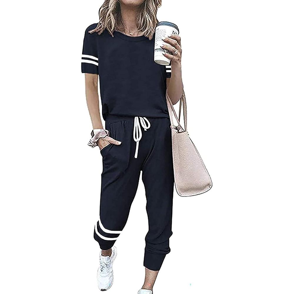 imagePRETTYGARDEN Women Summer Two Piece Outfits Striped Short Sleeve Pullover and Long Pants Tracksuit Travel Pajama Lounge SetNavy