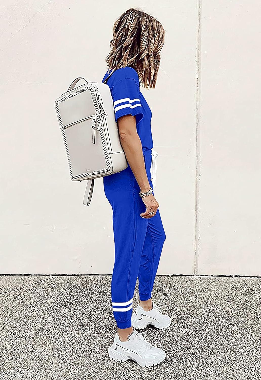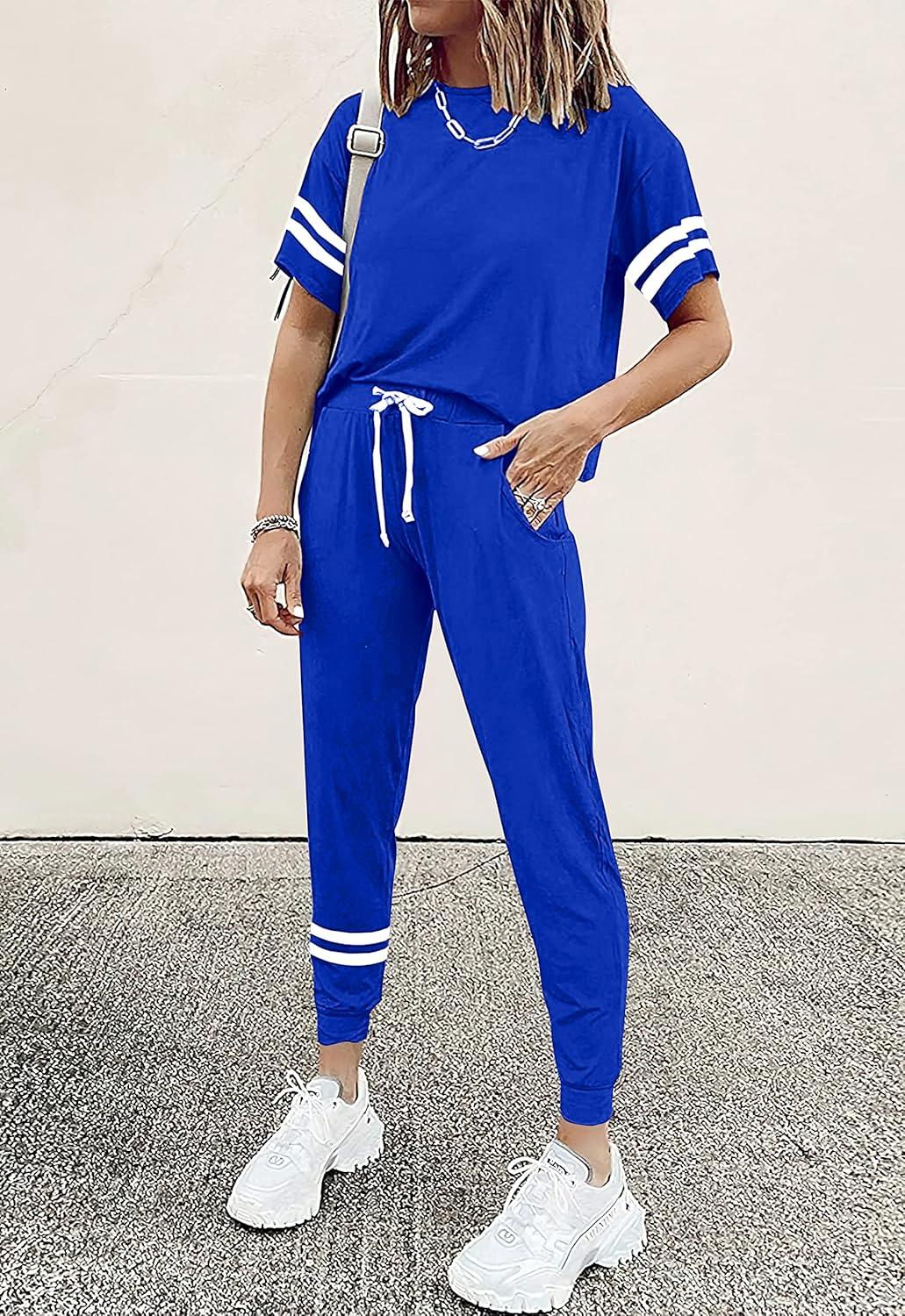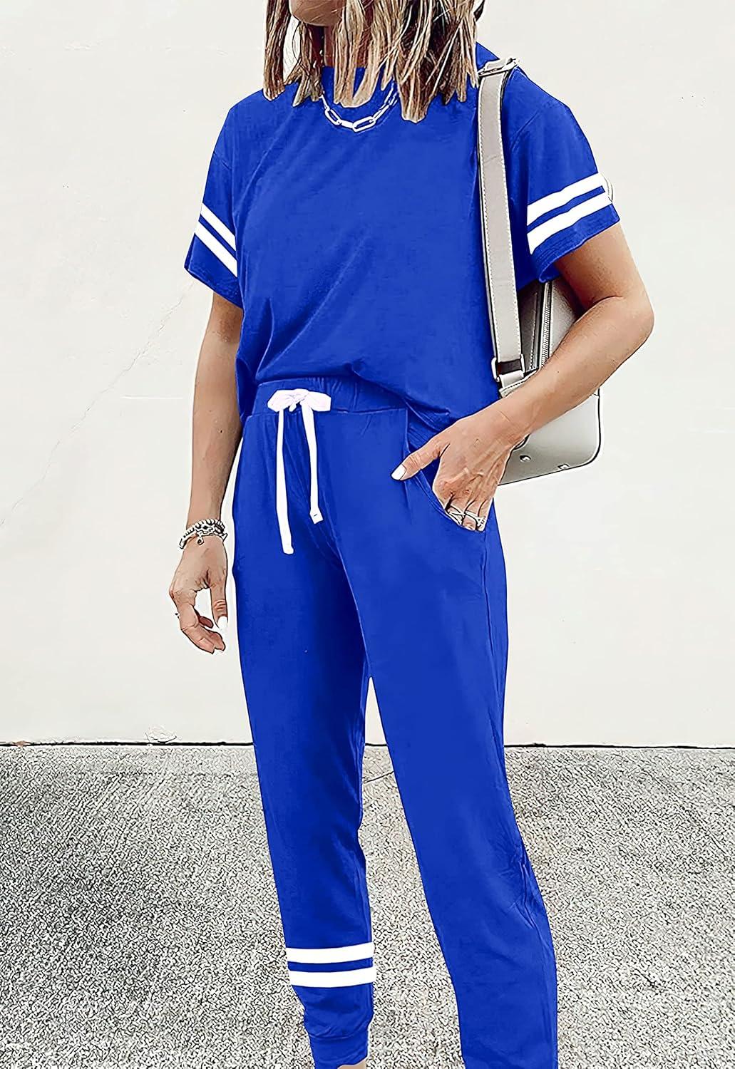 PRETTYGARDEN Women Summer Two Piece Outfits Striped Short Sleeve Pullover and Long Pants Tracksuit Travel Pajama Lounge Set(Royal Blue)