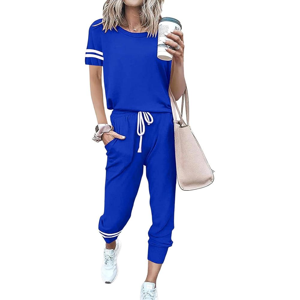 imagePRETTYGARDEN Women Summer Two Piece Outfits Striped Short Sleeve Pullover and Long Pants Tracksuit Travel Pajama Lounge SetRoyal Blue