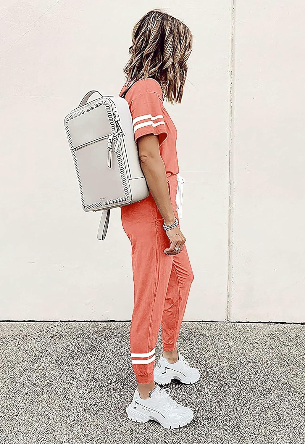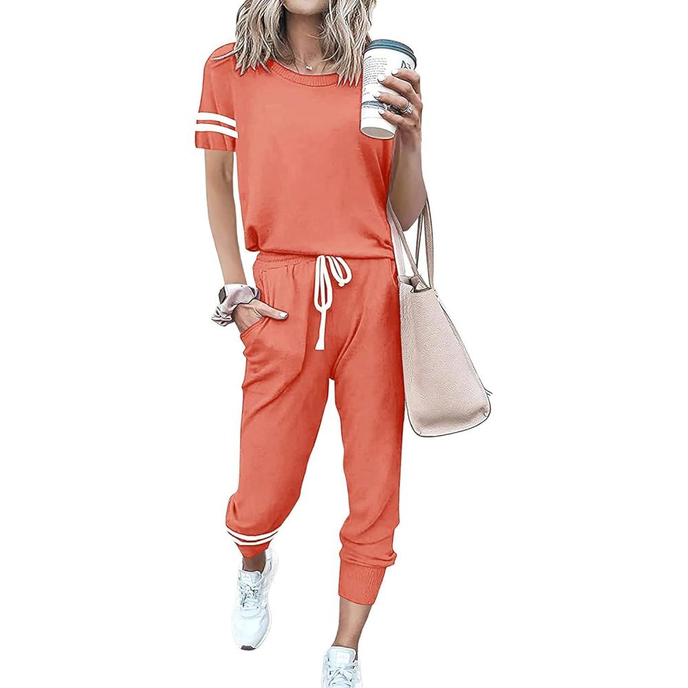 PRETTYGARDEN Women Summer Two Piece Outfits Striped Short Sleeve Pullover and Long Pants Tracksuit Travel Pajama Lounge Set(Shrimp Pink)