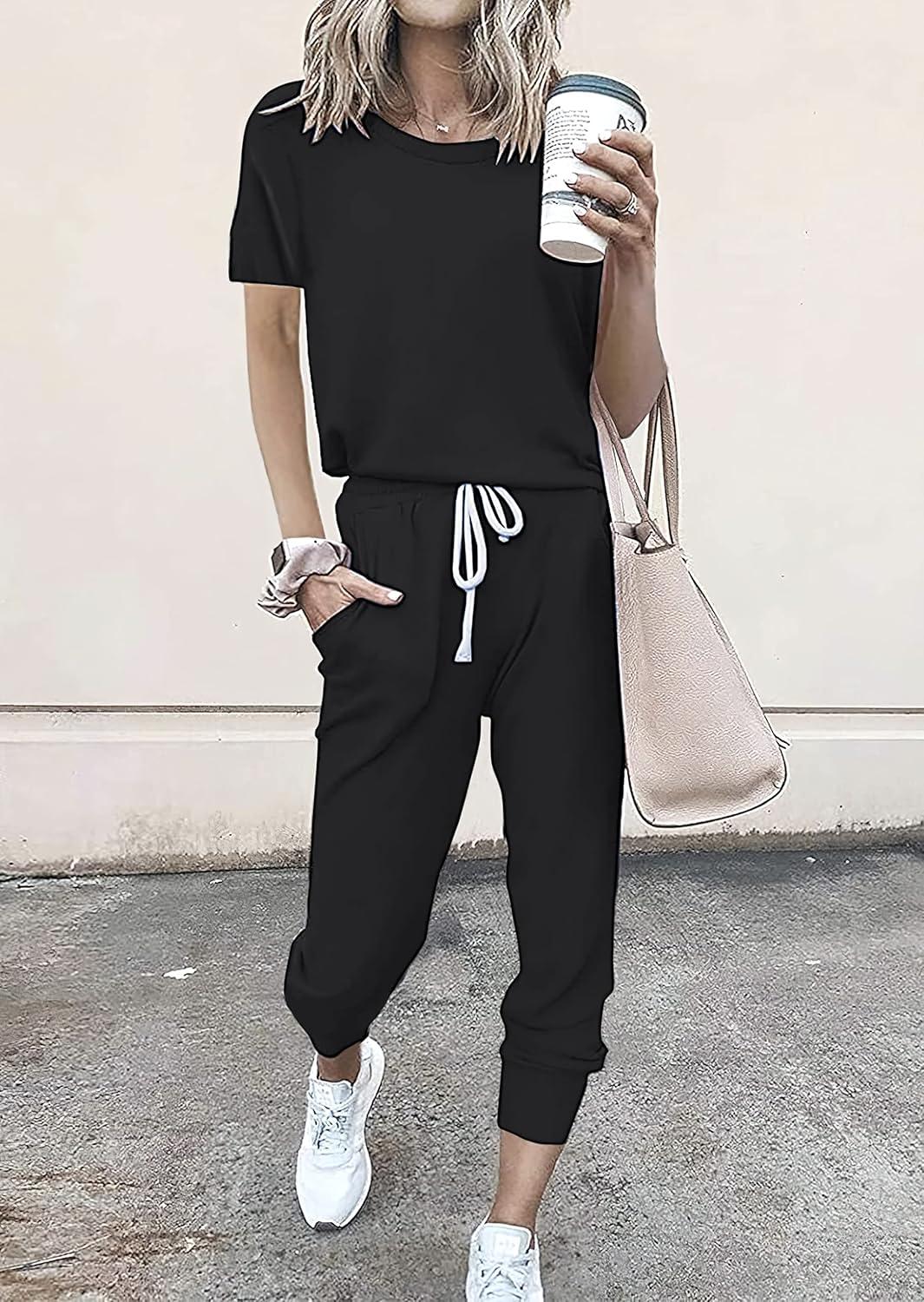 PRETTYGARDEN Women Summer Two Piece Outfits Striped Short Sleeve Pullover and Long Pants Tracksuit Travel Pajama Lounge Set(Solid Black)