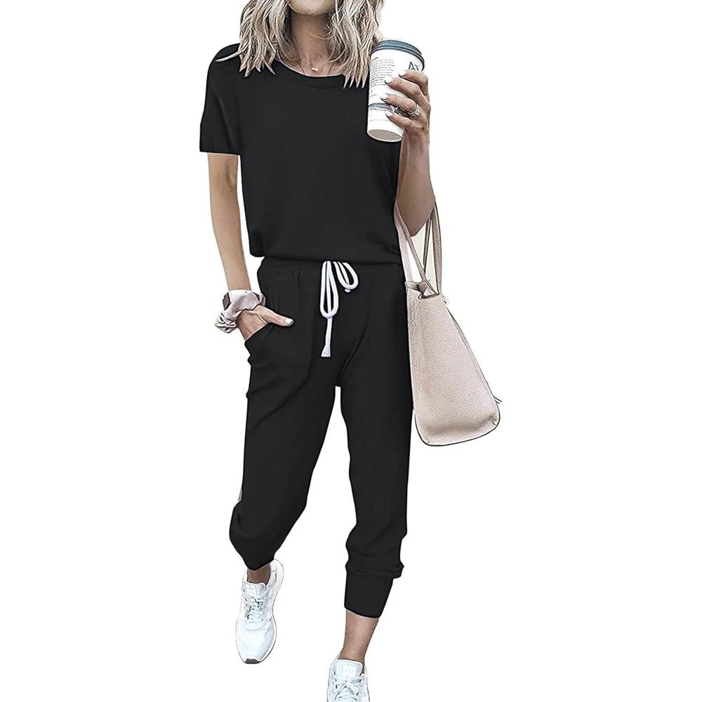 imagePRETTYGARDEN Women Summer Two Piece Outfits Striped Short Sleeve Pullover and Long Pants Tracksuit Travel Pajama Lounge SetSolid Black