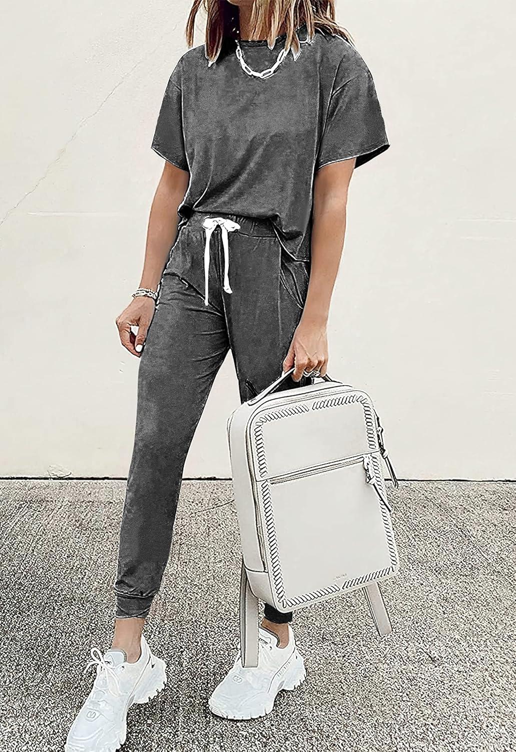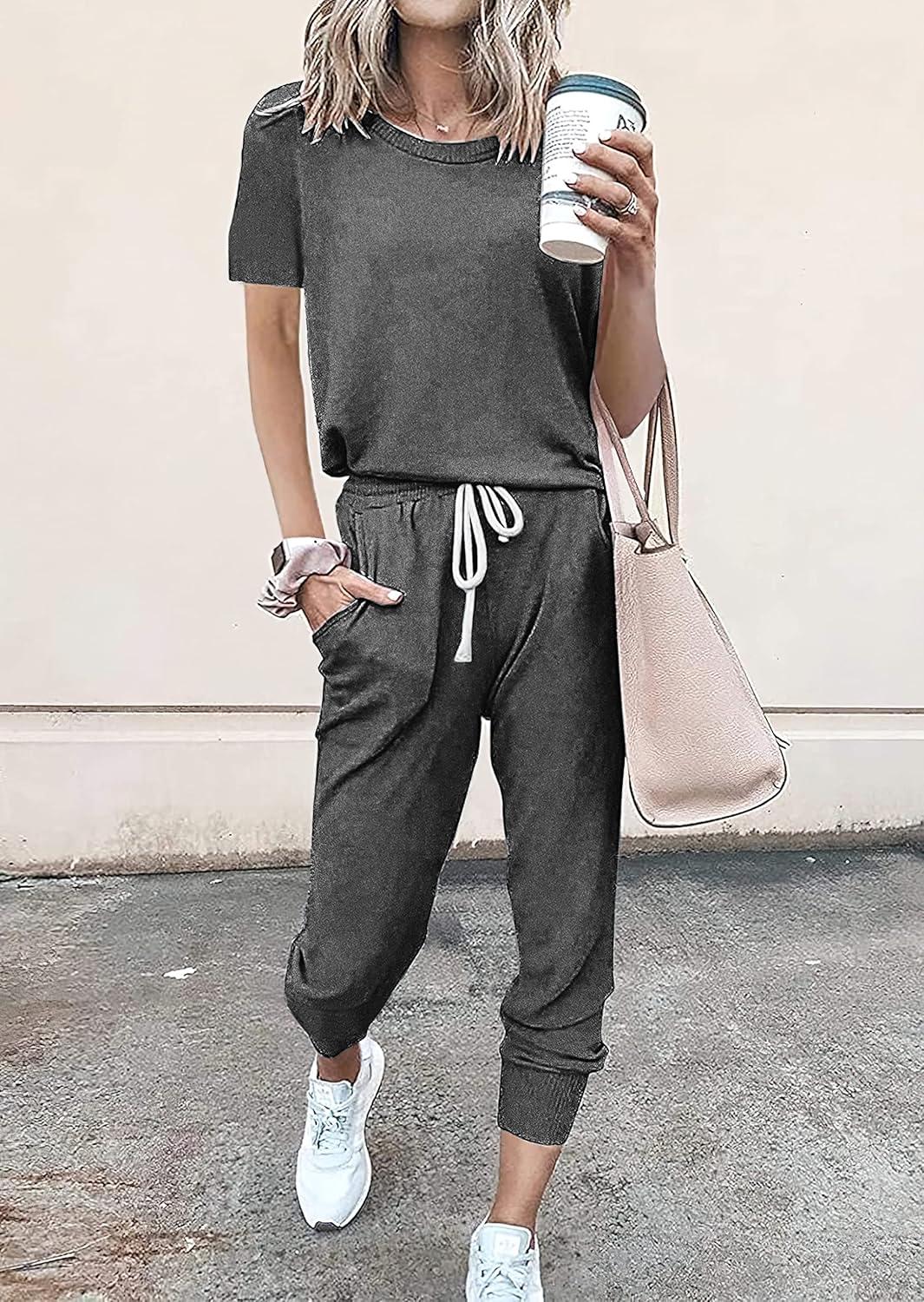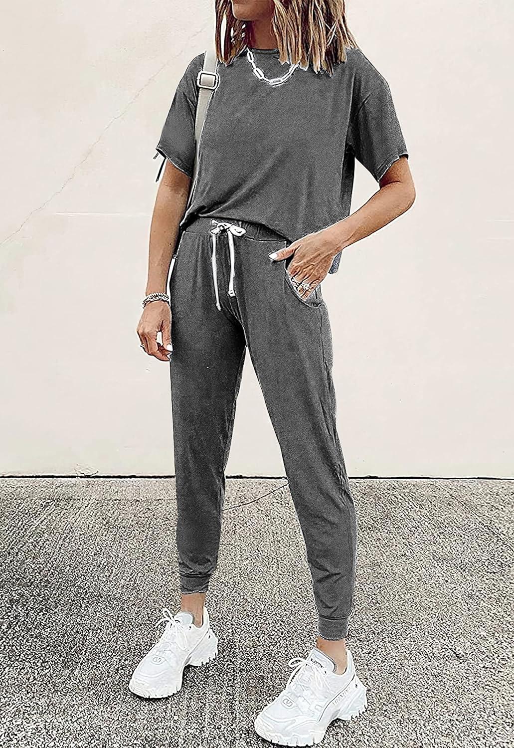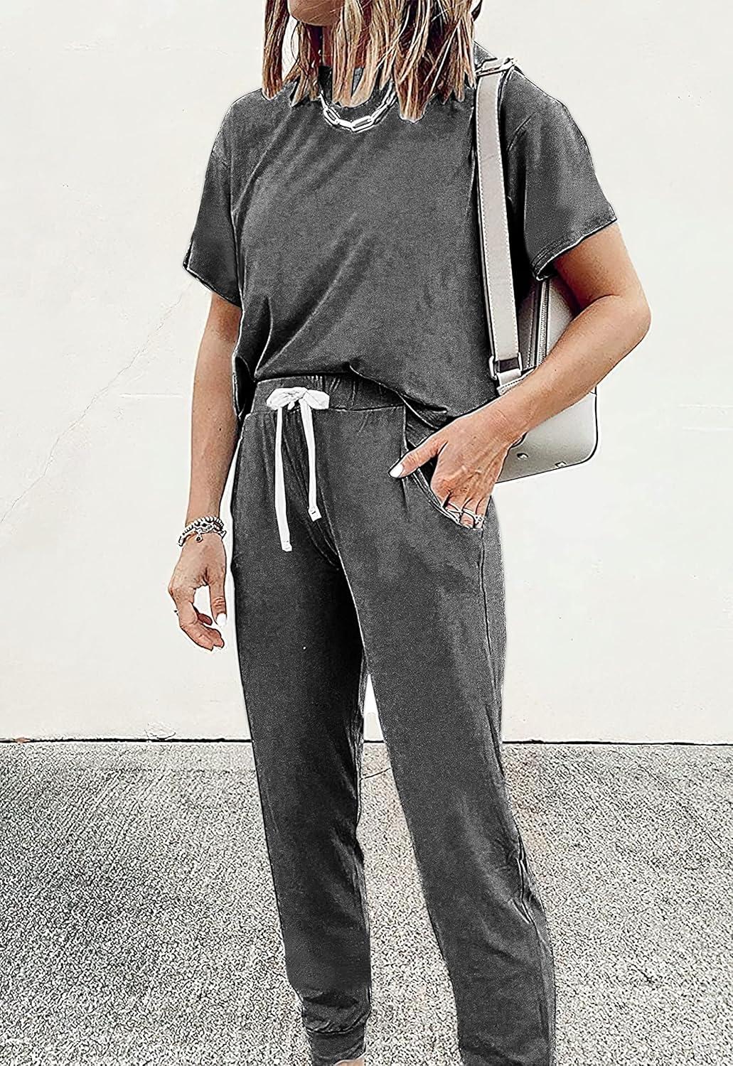 PRETTYGARDEN Women Summer Two Piece Outfits Striped Short Sleeve Pullover and Long Pants Tracksuit Travel Pajama Lounge Set(Solid Dark Grey)
