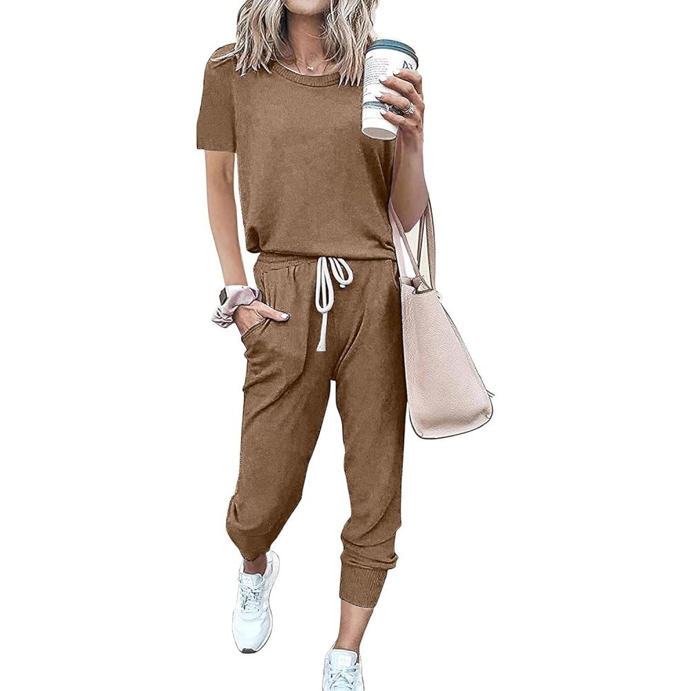 imagePRETTYGARDEN Women Summer Two Piece Outfits Striped Short Sleeve Pullover and Long Pants Tracksuit Travel Pajama Lounge SetSolid Dark Khaki