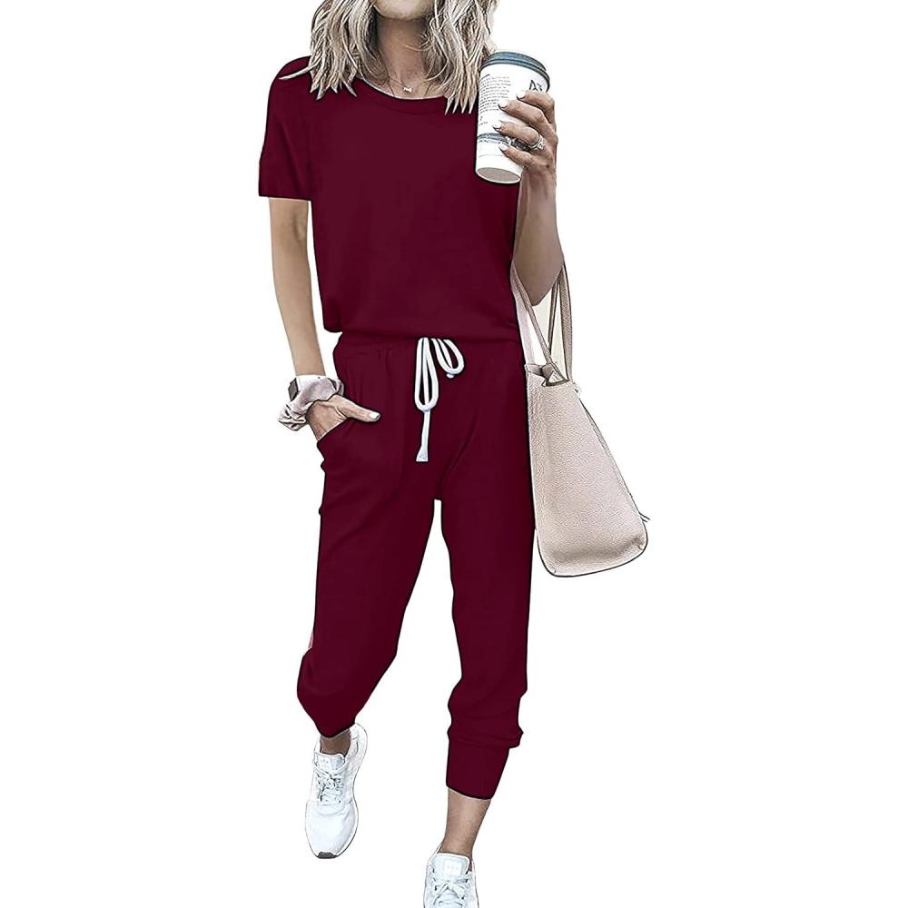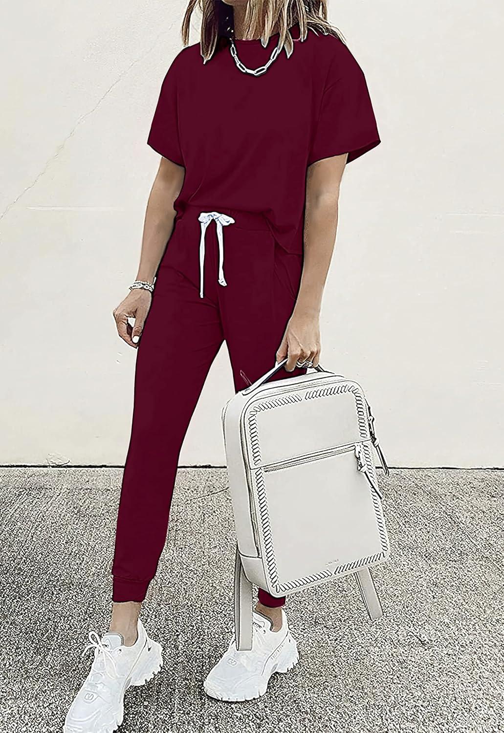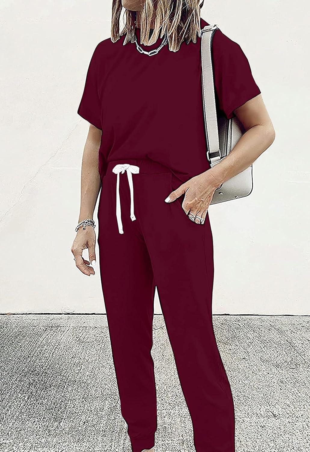 PRETTYGARDEN Women Summer Two Piece Outfits Striped Short Sleeve Pullover and Long Pants Tracksuit Travel Pajama Lounge Set(Solid Wine Red)