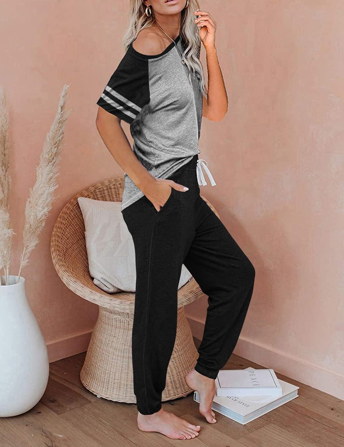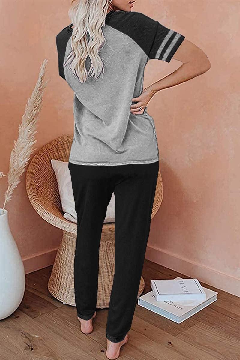 PRETTYGARDEN Women Summer Two Piece Outfits Striped Short Sleeve Pullover and Long Pants Tracksuit Travel Pajama Lounge Set(Z-black Grey)
